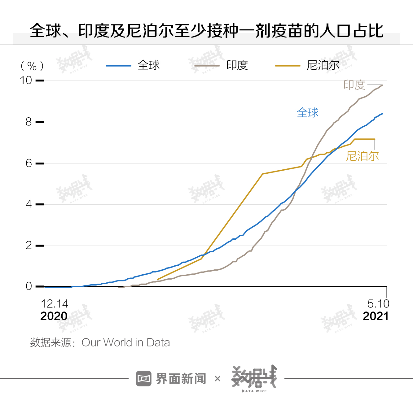 从对疫情防控最重要的疫苗接种来看,截至5月7日,尼泊尔至少接种一剂疫苗的人口占比仅为7.18%,比全球水平低1.07个百分点,比印度低2.41个百分点。