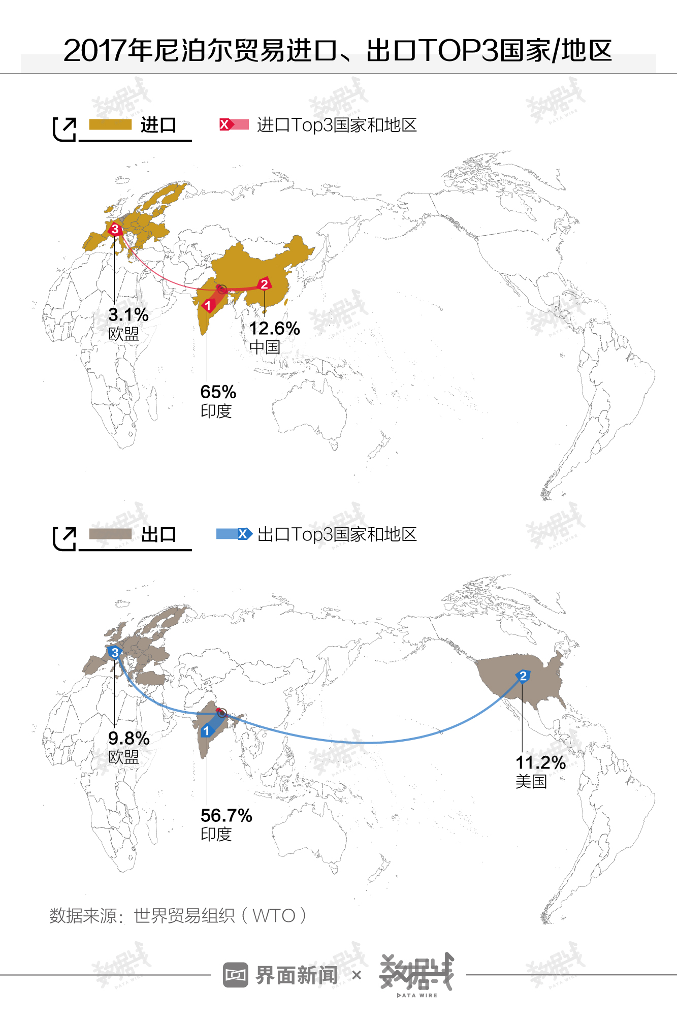 世界贸易组织(WTO)官网数据显示,印度是尼泊尔商品进口、出口占比最高国家。2017年,尼泊尔对印度进口、出口商品贸易占比分别为65%、56.7%。