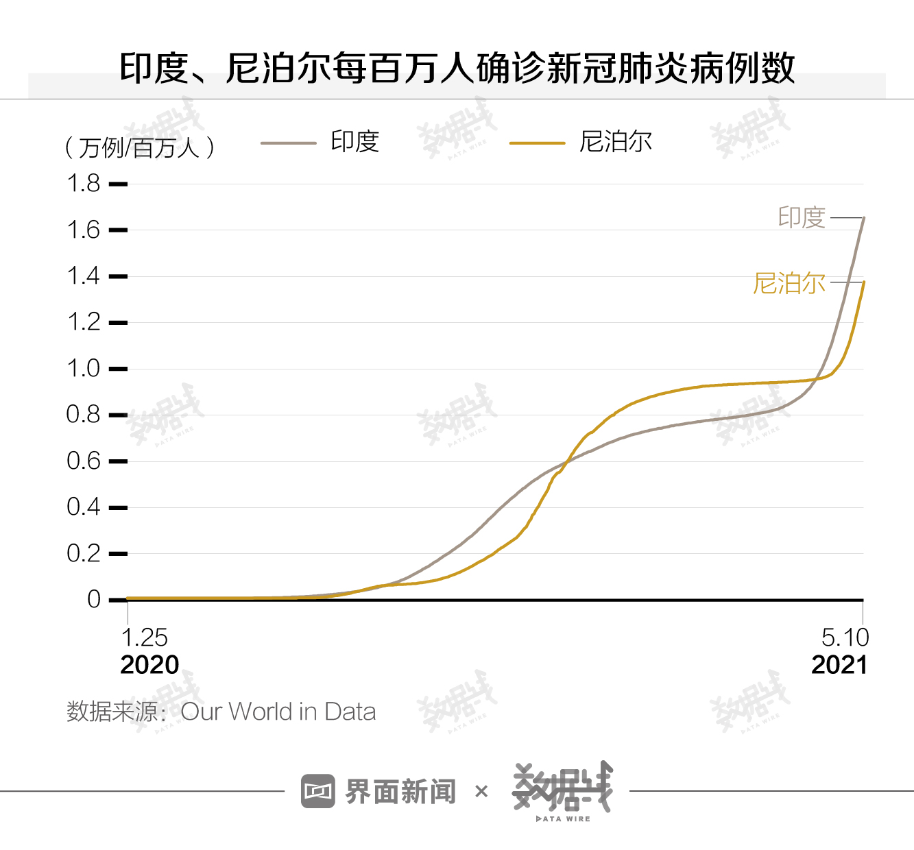 另一组数据——每百万人累计确诊病例数,尼泊尔走势也接近印度。截至5月10日,尼泊尔每百万人中有约1.39万新冠肺炎确诊病例,同印度(约1.67万)相差约2800例。