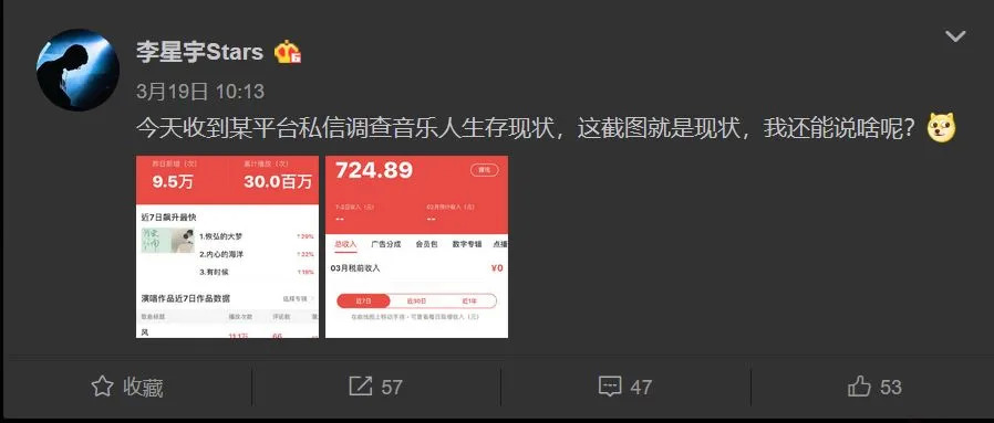 独立音乐制作人李星宇在微博晒出了自己的收入,尽管有3000万次的累计播放量,但最终他的可提现收益只有724.89元,还没有同等播放量的一个抖音视频变现多。