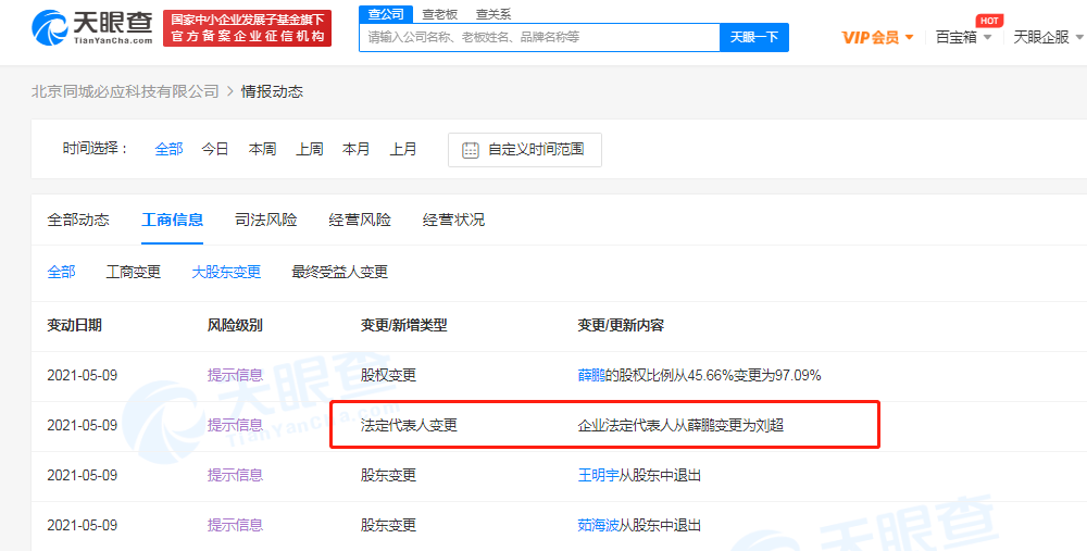 据天眼查APP显示,5月9日,闪送关联公司北京同城必应科技有限公司发生工商变更,闪送创始人薛鹏退出法定代表人,由刘超接任。