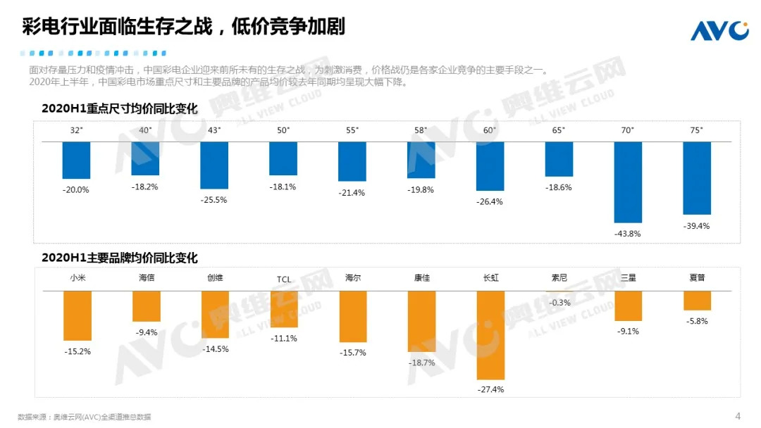 再来看彩电行业,在价格战影响下,产品均价下降明显。去年上半年,32英寸彩电均价和去年同期相比下降了20%,43英寸下降了25.5%,55英寸下降了21.4%,70英寸均价的降幅更是达到43.8%,换句话说,产品售价几乎是“拦腰斩断”。没有哪一家厂商逃得过均价下降的命运,国产主流品牌彩电均价降幅都在10%以上,“网红”小米也是如此,和去年同期相比均价降低了15%,另外如长虹下降27%、康佳下降18.7%、海尔下降15.7%。