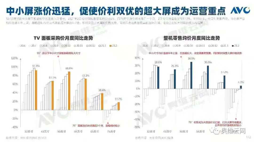 到了2021年,彩电涨价趋势不变。今年一季度,国内彩电行业出现了销量下跌但销售额上升的罕见现象。根据奥维云网公布的数据,今年一季度国内彩电销量对比去年同期下滑0.6%,但销售额却大幅增长了30.9%。