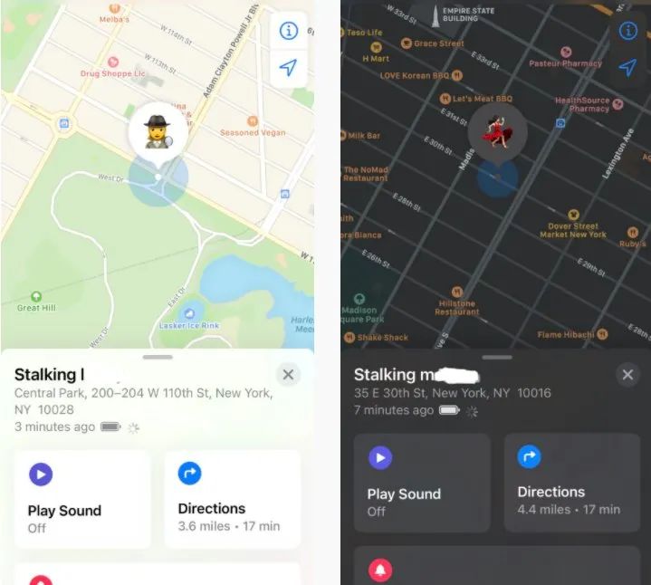 在两天的时间里,她的室友携带着AirTag分别在哈莱姆区和格林威治村活动,而人在曼哈顿和布鲁克林之间奔波的布伦达,随时都可以通过手机上的Find My应用程序看到两位室友的具体位置。这个距离已经远远超出了布伦达的手机蓝牙范围。