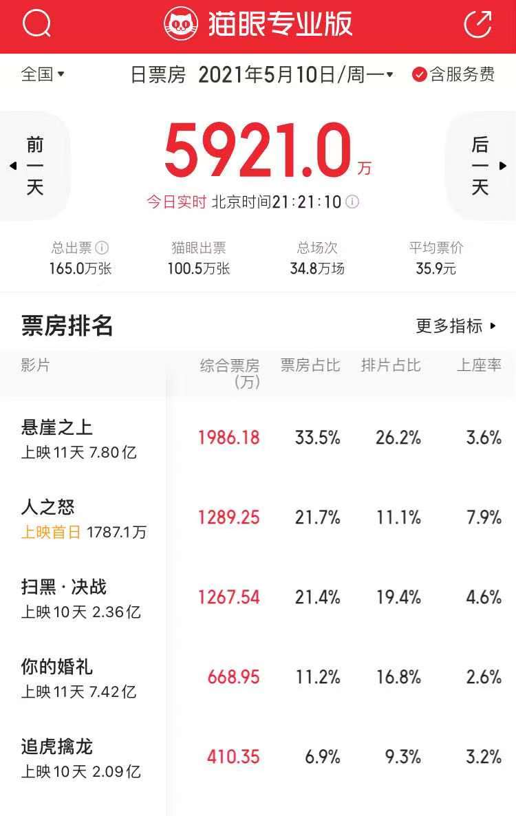 今天《人之怒》首日上映,由于起片较晚(下午18时起片),排片占比达到11%,票房发酵能力也不如预期,但是首映单日票房已经超过《你的婚礼》《扫黑·决战》等五一老片。而此后《人之怒》的排片价格上升至19%左右。虽然目前行业对于《人之怒》的票房预期并不算高,但是该片显然将对《悬崖之上》产生冲击。