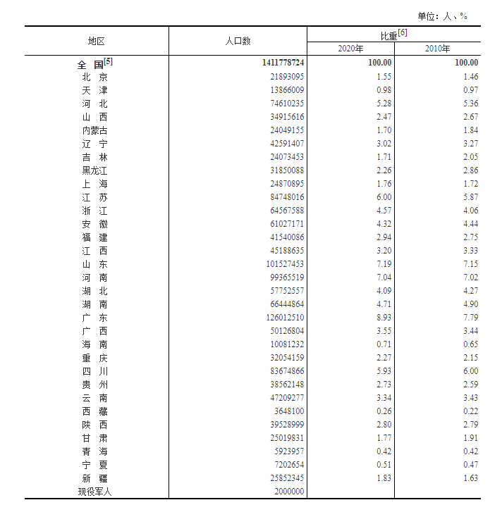 据第七次全国人口普查结果,全国人口共141178万人,与2010年(第六次全国人口普查数据,下同)相比,增加7206万人,增长5.38%,年平均增长率0.53%,比2010年的年平均增长率下滑0.04个百分点。