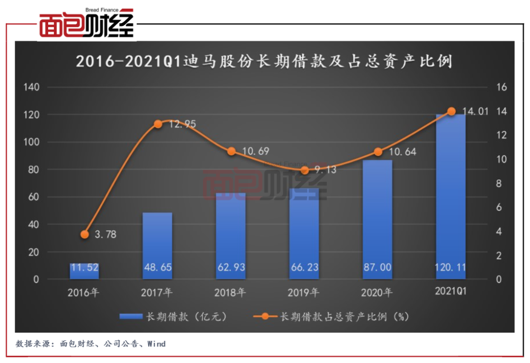 图2:2016-2021Q1迪马股份长期借款及占总资产比例