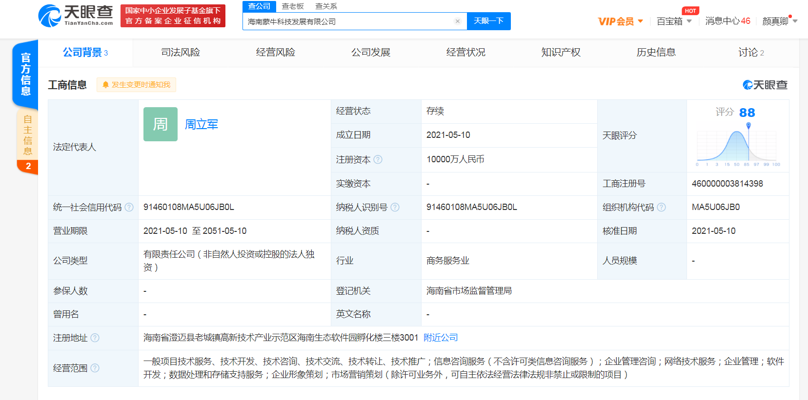 据天眼查APP显示,5月10日,海南蒙牛科技发展有限公司成立,法定代表人周立军,注册资本1亿人民币,经营范围包括信息咨询服务;企业管理咨询;企业形象策划等。股东信息显示,该公司由内蒙古蒙牛乳业(集团)股份有限公司100%持股。