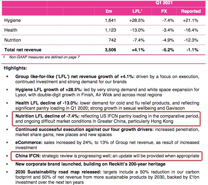 利洁时今年4月28日披露的一季度财报显示,大中华区的收入出现了双位数下滑,该报告也提及,中国婴幼儿营养业务的战略评估进展顺利,将适时更新最新进展。