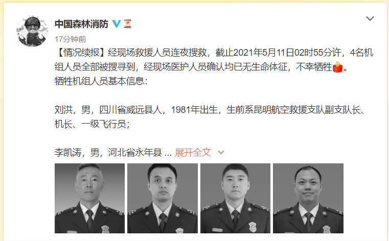 据@中国森林消防 5月11日通报,经现场救援人员连夜搜救,截至2021年5月11日02时55分许,4名机组人员全部被搜寻到,经现场医护人员确认均已无生命体征,不幸牺牲。