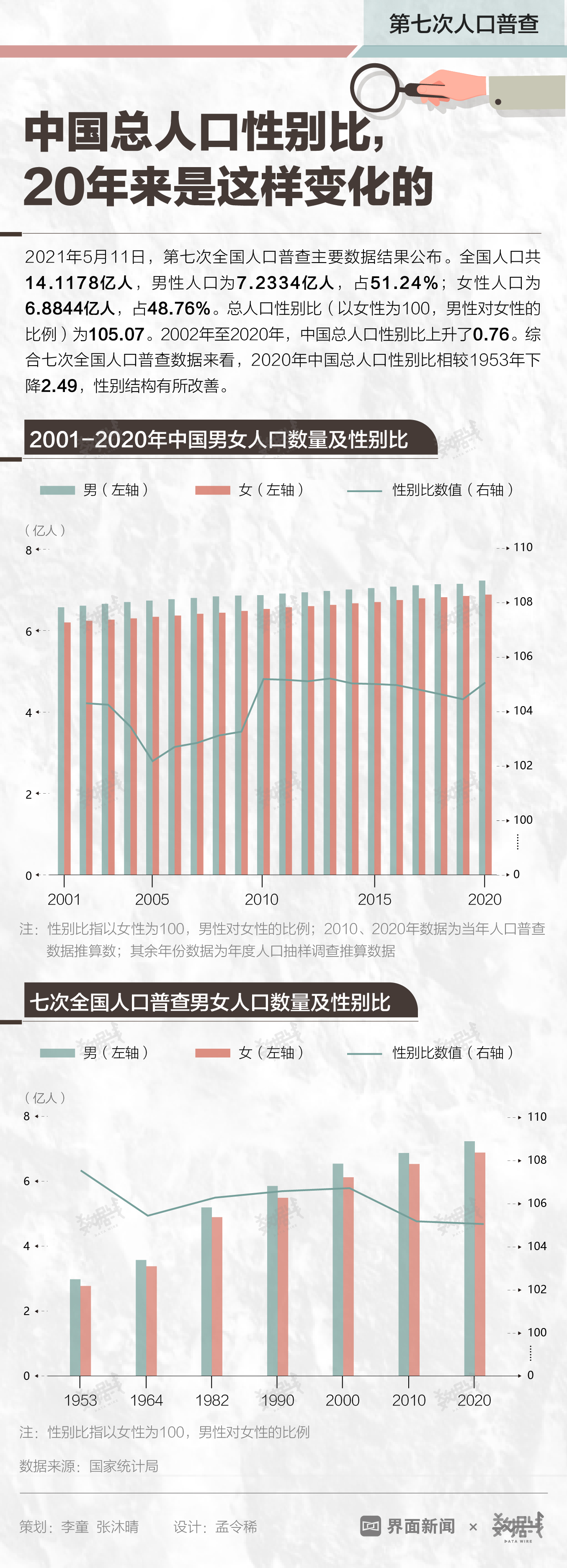 2020年中国总人口性别比相较1953年下降2.49,性别结构有所改善。