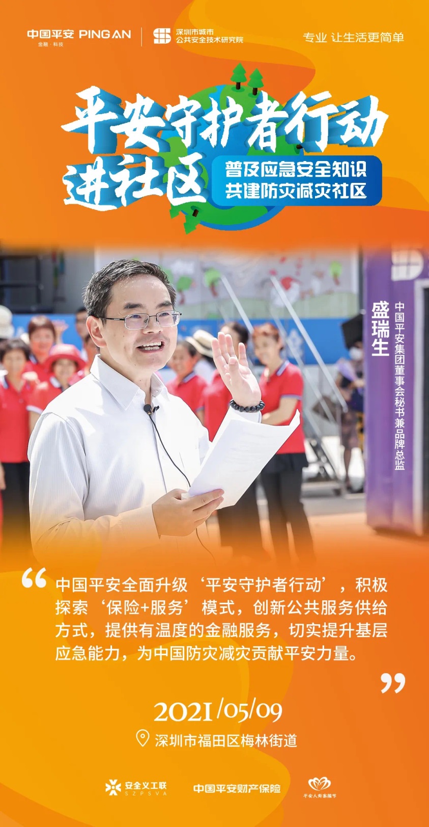 5月9日,第十三个全国防灾减灾日到来之际,在应急管理部紧急救援促进中心、深圳市应急管理局、共青团深圳市委员会指导下,中国平安联合深圳市城市公共安全技术研究院、深圳市公共安全义工联合会在深圳发起“平安守护者行动” 进社区活动。根据行动,中国平安将率先在深圳推出“1+3”公益防灾减灾体系,即为社区居民提供防灾减灾一揽子保险保障,并提供“防灾科普”“风险排查”“应急演练”等三项防灾减灾公益服务,打造综合减灾示范社区的“深圳模式”。