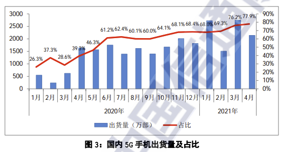 5月11日,中国信通院其官方网站发布2021年4月国内手机市场运行分析报告。报告显示,2021年4月,国内市场5G手机出货量2142.0万部,占同期手机出货量的77.9%;上市新机型16款,占同期手机上市新机型数量的50.0%。1-4月,国内市场5G手机出货量9126.7万部、上市新机型80款,占比分别为72.7%和51.9%。