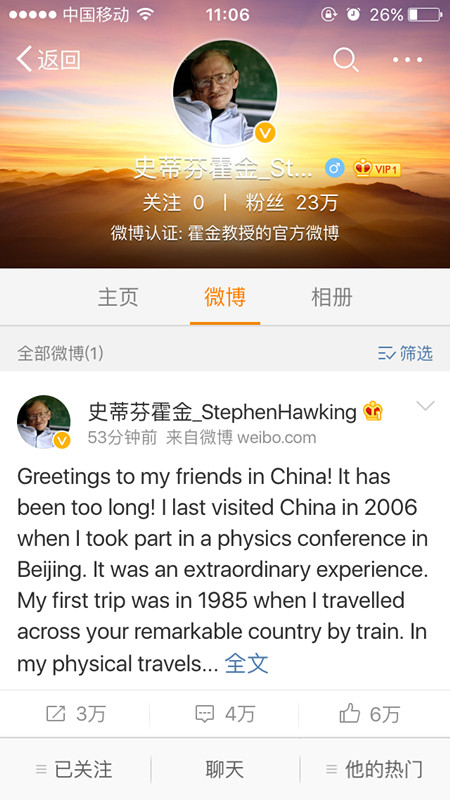 今日,著名物理学家史蒂芬·霍金在新浪开微博了。他的微博由他的团队和一家社交媒体公司共同管理,但有文末署有S.H的则为霍金本人撰写的文字。