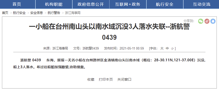 中国海事局网站5月11日消息,浙江海事局通报称,据报,一无名小船在台州路桥区金清镇南山头以南水域(概位:28-30.11N,121-37.00E)沉没,船上3人落水。