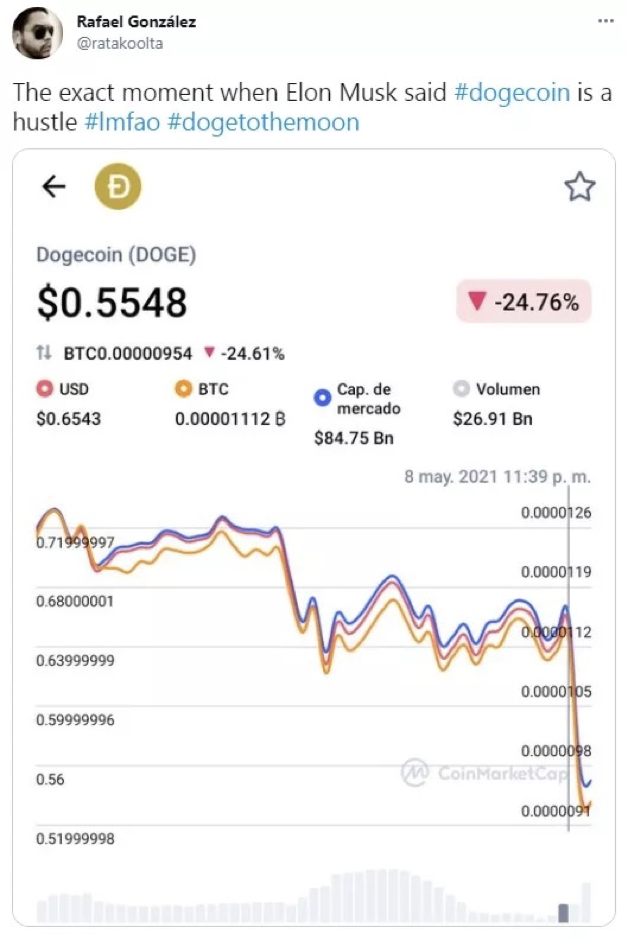 其他市场分析人士指出,此次马斯克“带货”失败,或许是狗狗币由涨变跌的转折点。