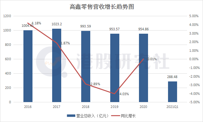 同时,高鑫多年来对线上赛道的加码,虽然有线上的成果,但依然入不敷出,严重拖累整体营收。2019年,总销售收入同比增长0.5%,2020年,零售销售收入同比增长0.14%,而在这份财报,增长为负2.01%,也就是在今年一季度,营收缩减更大。