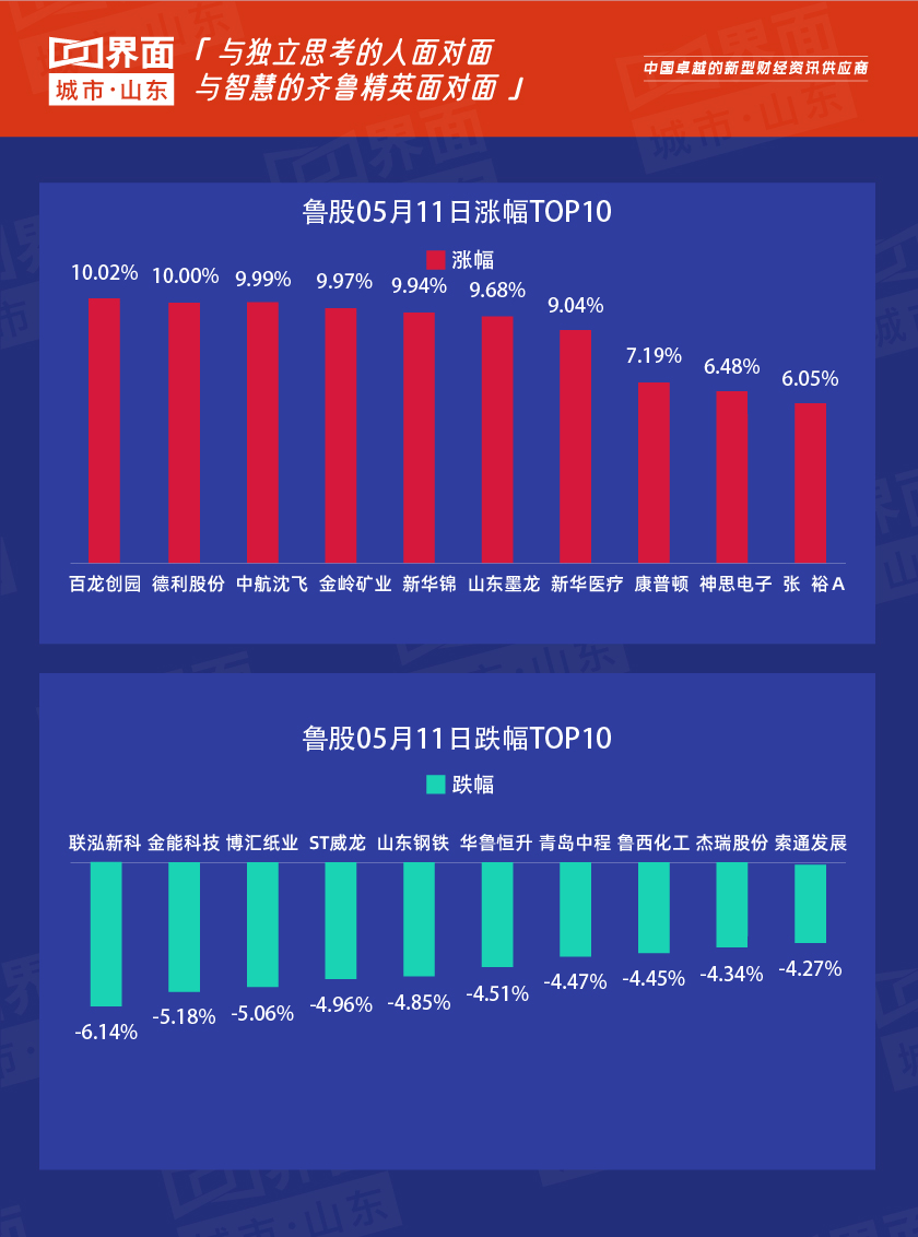 受大盘影响,5月11日,山东省内沪深股票有120只个股上涨,107只下跌,百龙创园领涨。