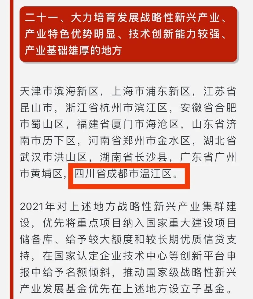 此次督查激励的地方名单共30组,其中,大力培育发展战略性新兴产业、产业特色优势明显、技术创新能力较强、产业基础雄厚的地方为成都市温江区等12个地方。