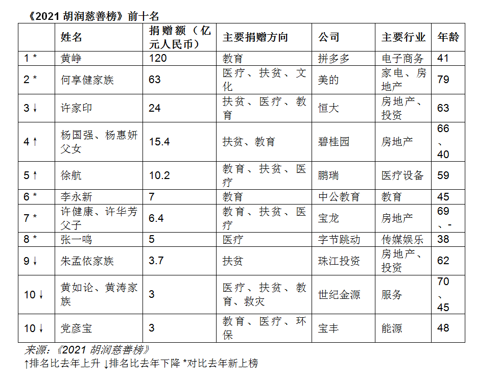 《2021胡润慈善榜》上榜门槛为1亿元。胡润研究院共找到来自16个城市的39位中国最慷慨慈善家过去一年捐赠都超过1亿元,共计捐赠301亿元。上榜慈善家中,有53%是以企业名义进行捐赠的,47%是以个人或家族名义进行捐赠的。前十位上榜慈善家均位列今年胡润全球富豪榜,除去第一名黄峥后平均捐赠额占他们平均财富的0.9%。