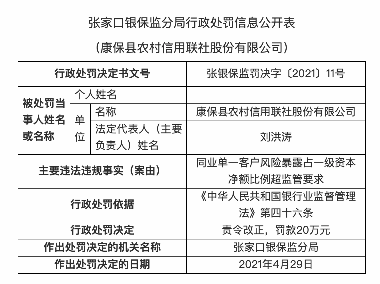 5月11日,张家口银保监分局发布的行政处罚信息公开表显示,康保县农村信用联社股份有限公司因同业单一客户风险暴露占一级资本净额比例超监管要求,被责令改正并处罚款20万元。