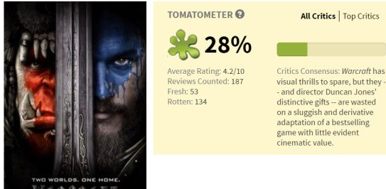 中国的魔兽粉丝很愿意为情怀买单,所以《魔兽》的票房可以超过10亿元,但在北美这种文化娱乐比较丰富,且习惯了这种商业化IP大片的地区来说,用户就不买账了,烂番茄指数28%,不折不扣的烂片。
