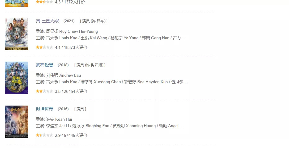 其豆瓣评分更是惨不忍睹目前是4.1分,这个评分在主演之一被誉为“烂片之王”古天乐所有有评分的影视剧当中排在倒数第三,后面两个是3.5的《武林怪兽》、2.9的《封神传奇》。