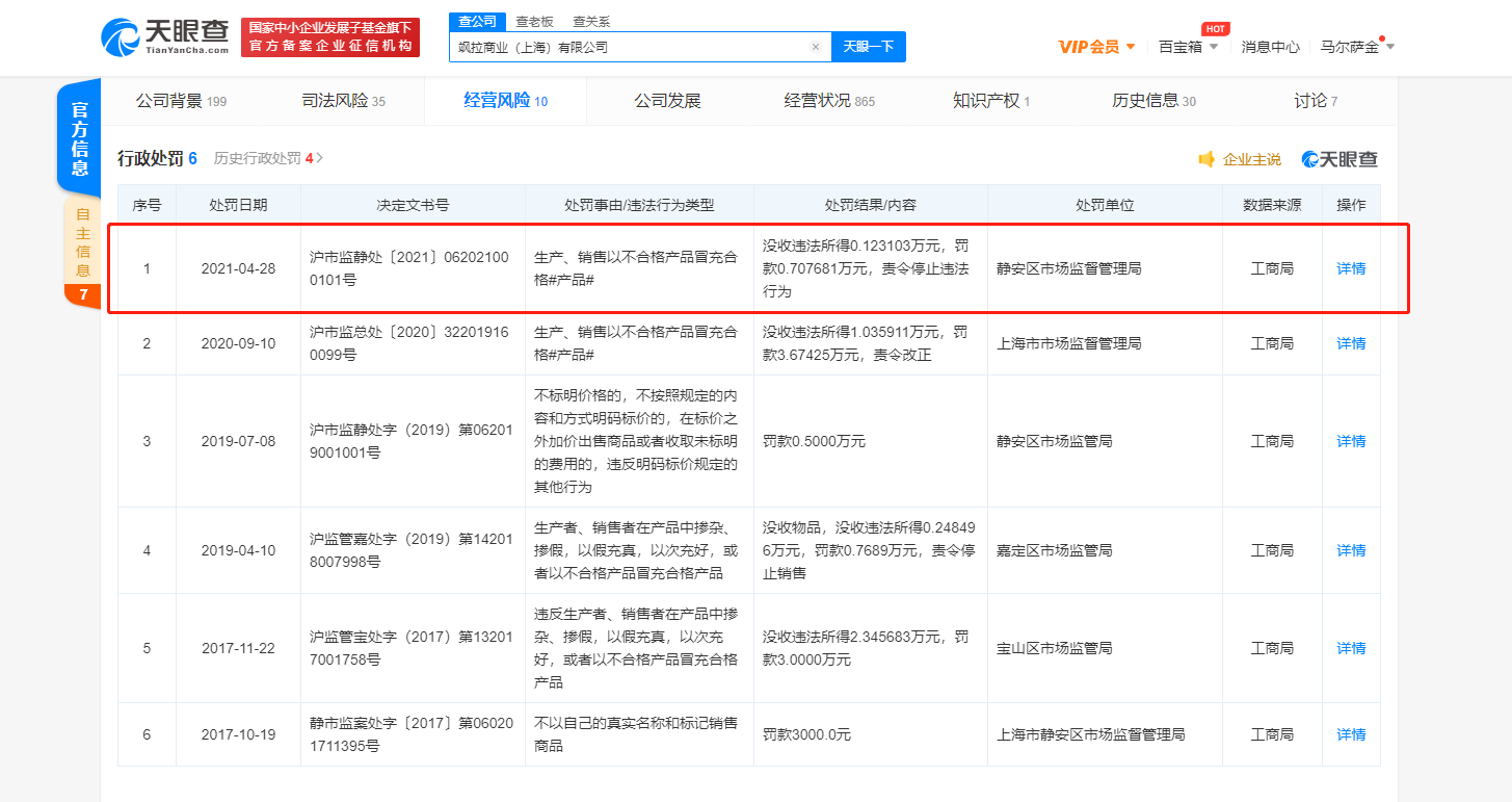 据天眼查APP显示,近日,ZARA关联公司飒拉商业(上海)有限公司新增一条行政处罚信息,决定文书号沪市监静处〔2021〕062021000101号,处罚事由为生产、销售以不合格产品冒充合格产品,处罚结果为没收违法所得0.123103万元,罚款0.707681万元,责令停止违法行为,处罚单位为静安区市场监督管理局。