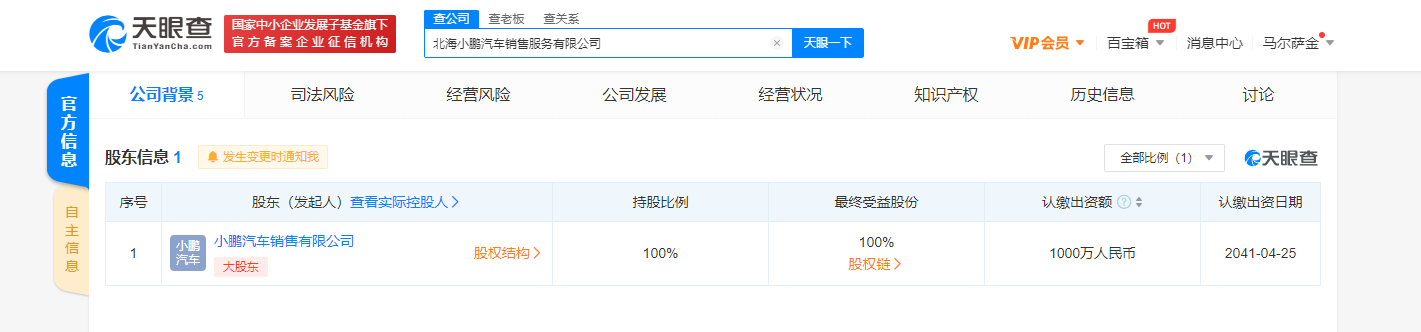 据天眼查APP显示,近日,北海小鹏汽车销售服务有限公司成立,注册资本1000万人民币,法定代表人为朱艳华。经营范围包括新能源汽车整车销售;新能源汽车换电设施销售;二手车经销;电动汽车充电基础设施运营;新能源汽车废旧动力蓄电池回收及梯次利用(不含危险废物经营)等。股权穿透图显示,该公司由小鹏汽车销售有限公司100%持股。