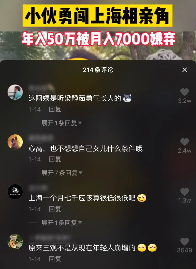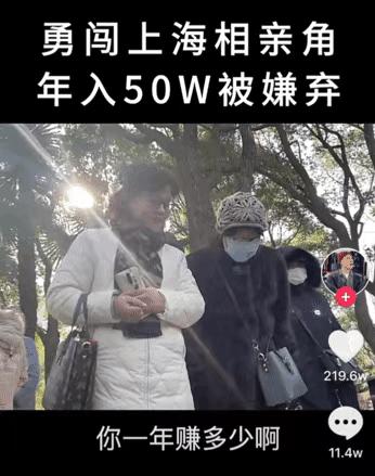 这股“歪风邪气”最早是从上海刮起来的。今年初,#小伙勇闯上海相亲角遭鄙视#的话题空降抖音热搜。该视频里,博主走进人民公园相亲角,自称年薪五十万仍遭阿姨嫌弃“在上海不算高”,还因没车没房没本地户口被侃“三无产品”。