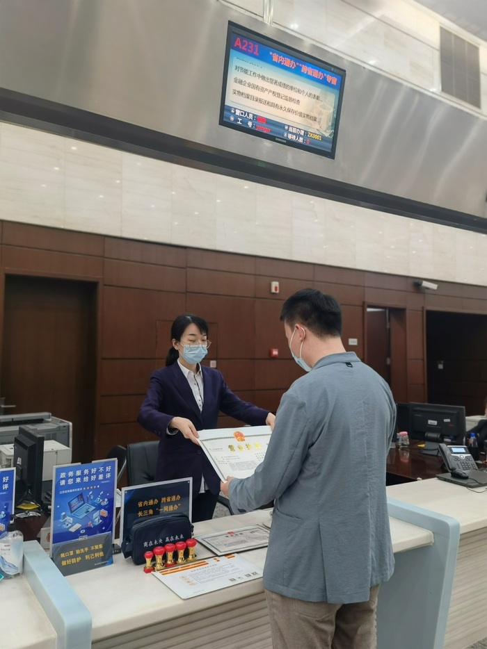 在了解到夏先生的企业开办需求后,未央方面工作人员迅速启动“跨省通办”模式,先将企业开办相关的流程进行介绍,随后将企业开办详细流程发送给夏先生,全程电话指导夏先生通过陕西政务服务网登录西安市市场主体网上登记平台完成企业开办自主申报,并第一时间在后台进行了审核,公司设立登记顺利完成。营业执照正本、副本还有免费刻制的印章通过未央区政务综合服务大厅提供的免费邮递业务2天后送达了南京市政务服务中心,夏先生在“跨省通办”窗口统一领取营业执照及公章。 夏先生激动地说到:“没想到不用去当地,连纸质材料都不用交,3个小时不到就能完成企业设立,真是太方便了!”。