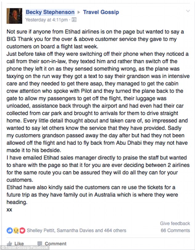 阿提哈德航空公司(Etihad Airways)一架航班的机长在飞机起飞前临时调转机头,送一对夫妇回到地面,让他们能与病危的孙儿见最后一面。
