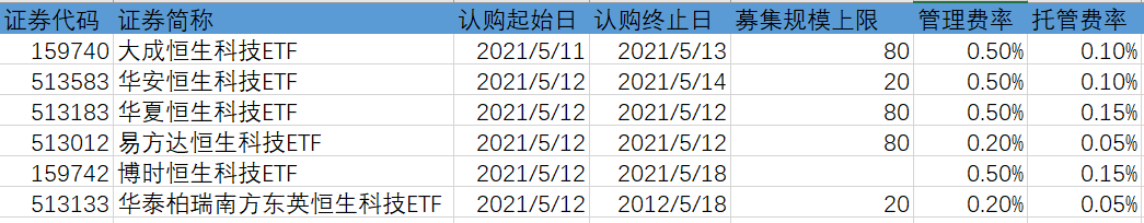 自5月11日起,首批6只恒生科技ETF大张旗鼓的开始募集。其中,大成恒生科技ETF抢在最先,发售期为5月11日至5月13日;其余5只基金均是今日发售。