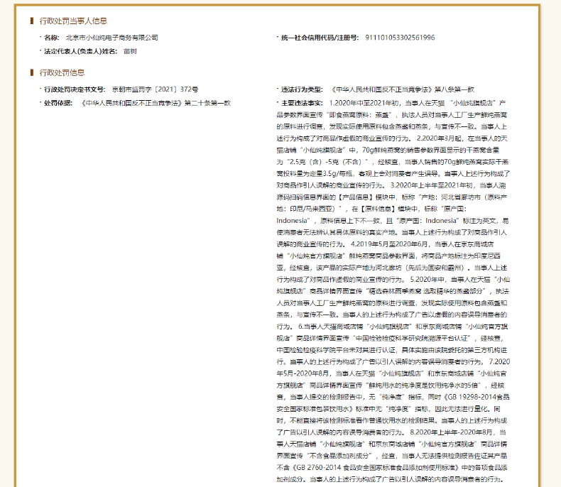 值得一提的是,2020年11月,“小仙炖”公司还曾被北京市朝阳区统计局行政处罚,处罚事由/违法行为类型为提供不真实的统计资料。截至目前,该公司已经两次被公开处罚。