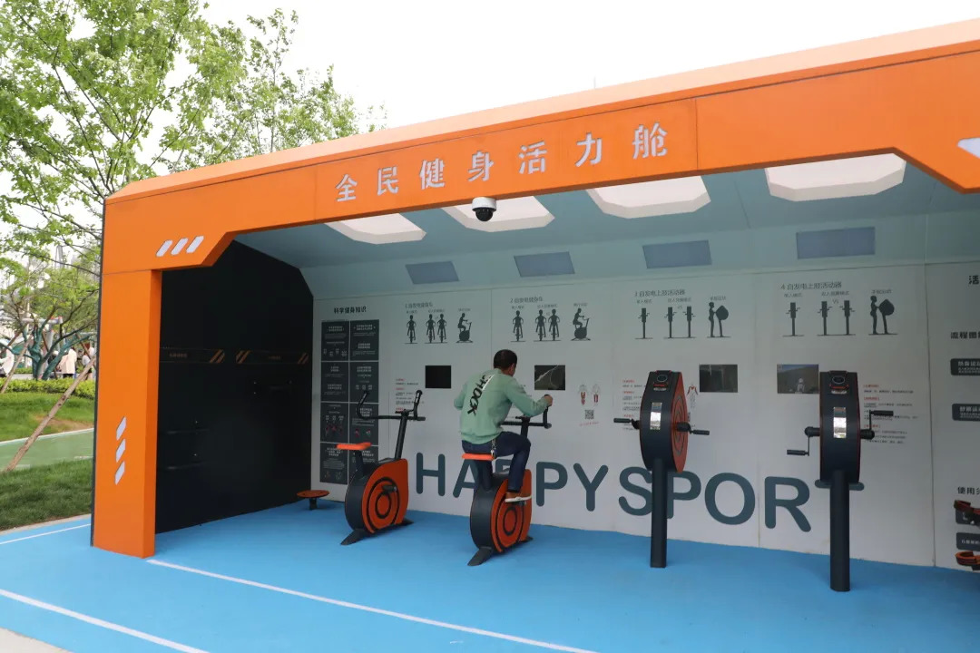 环视园内,智能健身步道,沿途有动态人脸识别感应摄像头,还有多功能心率健康柱和户外互动大屏,健身群众可以扫描仪器上的二维码,便可在手机端和互动大屏上看到自己的相关数据;通过这些设备,还可以了解步道人流量及用户运动数据,实时掌握自己的运动强度与状态,以及当前运动人数、运动排名等情况。全民健身体测舱可以进行12个智慧化项目测试;1200米长的健身步道采用了高科技材料,不仅具有耐磨、使用寿命长、减震效果好、清洗方便等特点,还有节能环保,白天吸收阳光,晚上可以发光的功能。此外,公园运营采用数字化管理模式,实现“无人值守”和“一站式运动管家服务”。