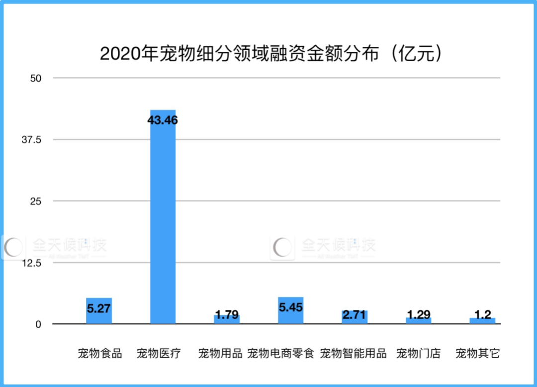 据宠物家不完全统计,2020年国内宠物行业共发生融资事件39起,较2019年减少2起;宠物医疗领域共发生6起,与宠物电商赛道并列第二,落后于宠物食品(11起);但宠物医疗领域融资规模最高,约有43.46亿元。