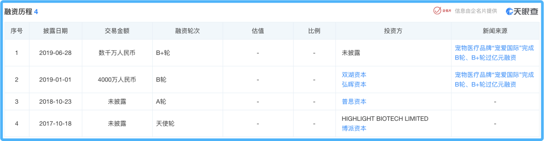 宠爱国际成立于2013年12月,已经在全国拥有数十家动物医院,覆盖全国主要一二线城市。天眼查信息显示,截至2019年6月,公司已经获得4轮融资,投资方包括双湖资本、弘晖资本和王思聪的普思资本等。