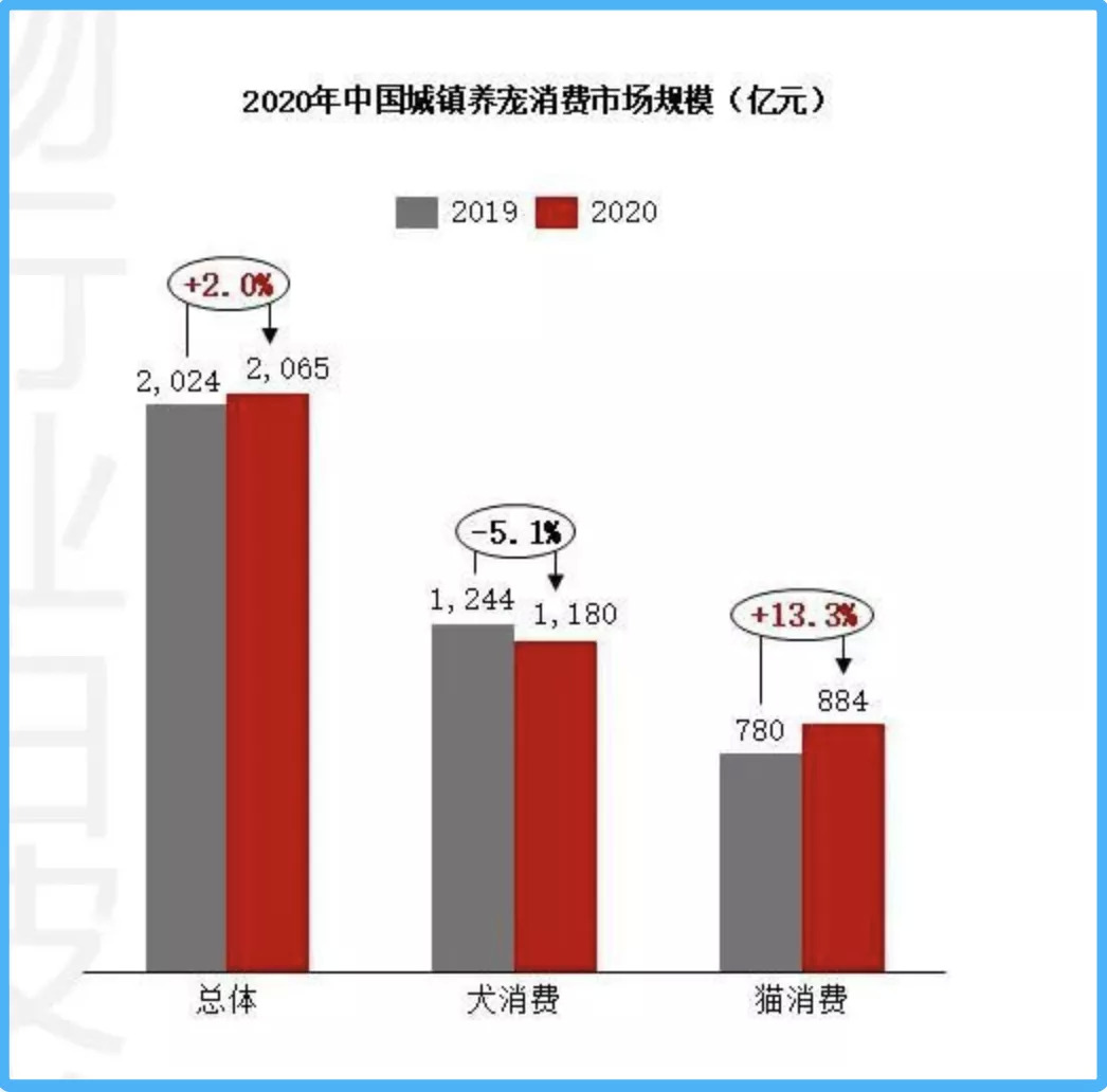 《白皮书》显示,2020年全国城镇犬猫数量已经超过1亿只,较2019年增长1.7%;养宠主人达到6294万人,较2019年新增174万人;城镇宠物(犬猫)消费市场规模达到2065亿元,比2019年增长2%。这届年轻人已经通过吸猫撸狗,成功“撸”出了千亿规模消费市场。
