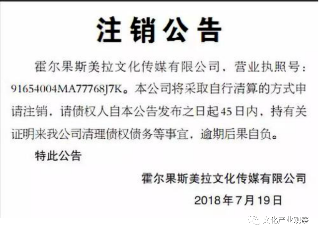 2018年,霍尔果斯决定逐步收紧优惠政策,同年6月,当地出现影视公司“注销潮”,而在范冰冰、郑爽接连出事后,这股“注销潮”愈演愈烈,想要了解此事更多分析可阅读公众号往期文章——限薪败北:郑爽被查后,众明星纷纷注销关联公司
