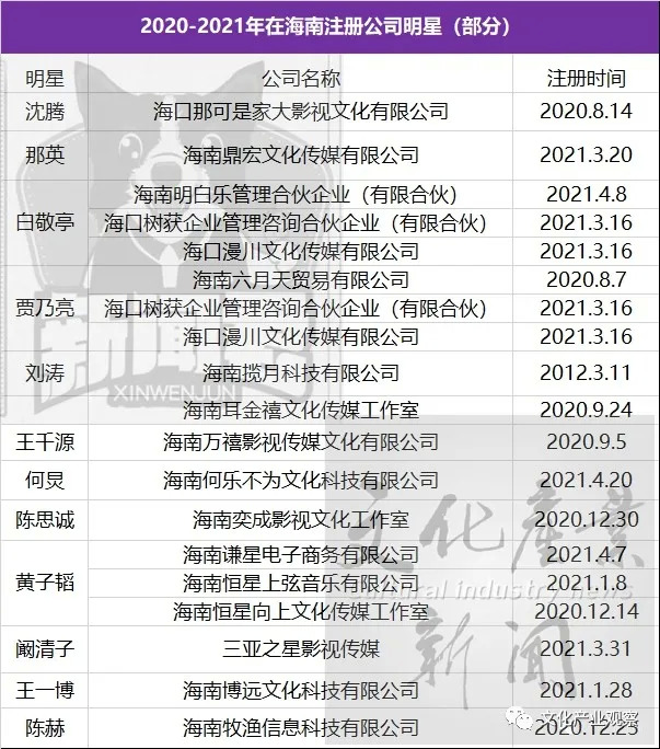 据不完全统计,自2020年起,多位影视界从业人员选择在海南投资成立影视公司,其中王千源、那英、陈赫、白敬亭、沈腾等明星新公司选址海口,陈思诚、侯鸿亮、阚清子等选址三亚,何炅、韩庚、黄子韬、王一博等选址澄迈县。