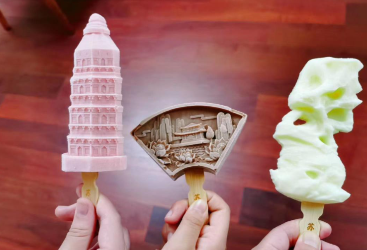 虽说发挥空间有限,但也不乏螺蛳壳里做道场的优等生。江西滕王阁造型雪糕,雪糕棒签上还附有名句“签文”;甘肃莫高窟的“九层楼”雪糕,雪糕棒可当作书签使用;西湖文创雪糕一直是卖断货的网红选手,许仙白娘子断桥相会、梁祝化蝶等传说均成为雪糕造型主题,引得小情侣纷纷解囊。