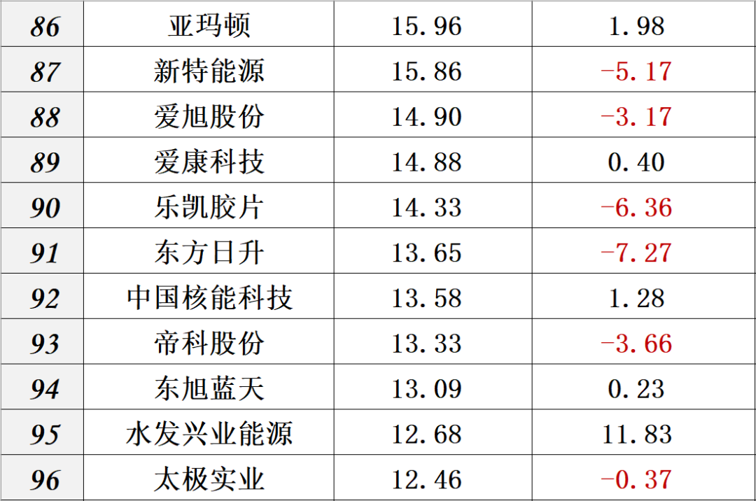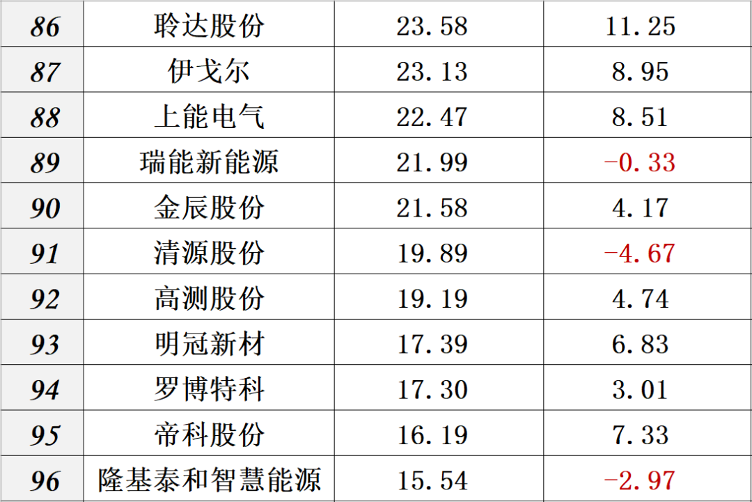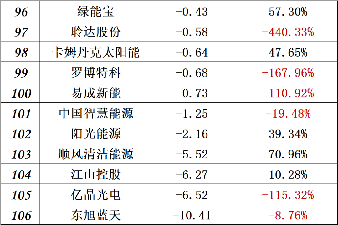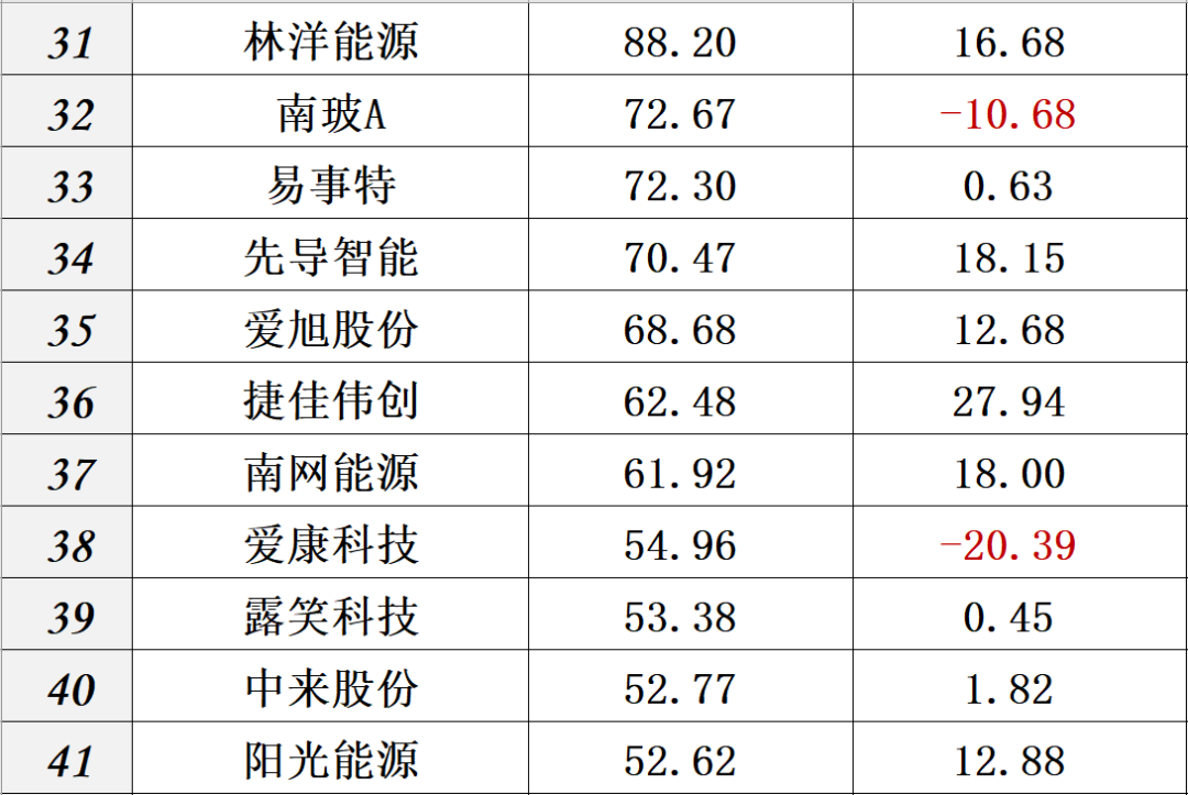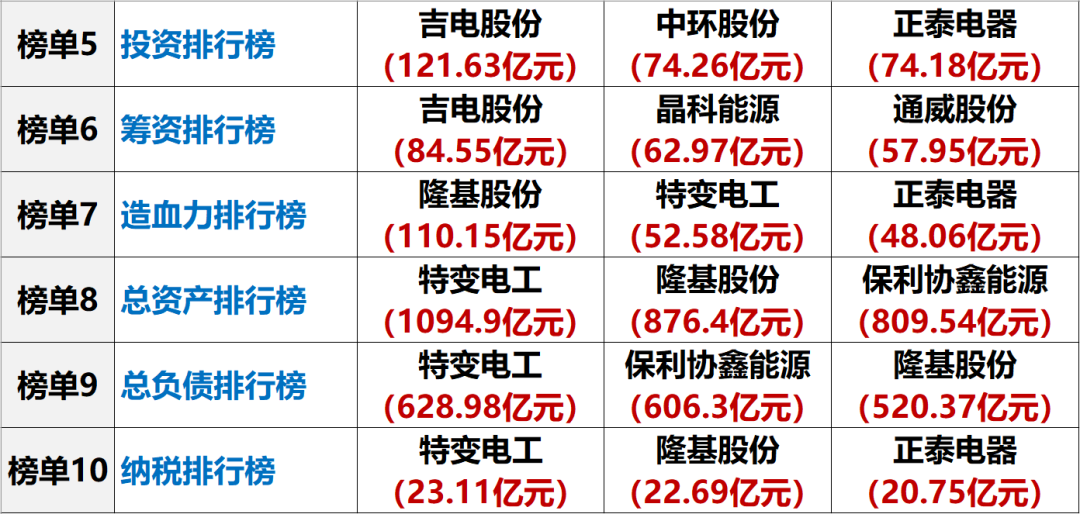 其中,92家光伏企业经营现金流净额为正(资金净流入),73家光伏企业经营现金流净额在1亿元以上,27家企业在10亿元以上,前三名为隆基股份、造血110.15亿元,特变电工、造血52.58亿元,正泰电器、造血48.06亿元。