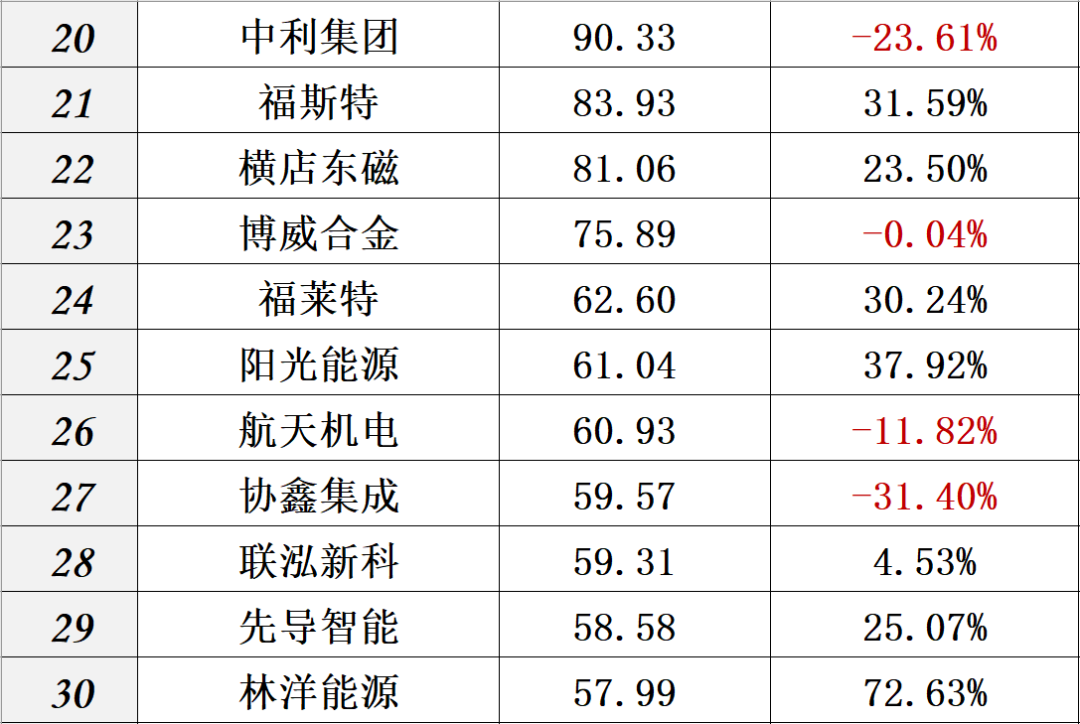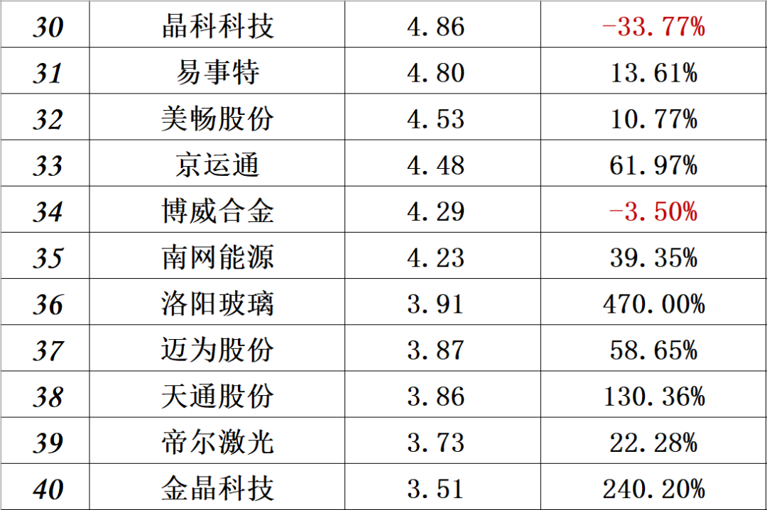 从增速看,2020年80家企业净利润实现正增长,其中32家企业实现100%以上高速增长。在净利润达10亿元规模的企业中,增长最快的前三名企业为福莱特、增长127.09%,阳光电源、增长116.73%,信义光能、增长77.32%。