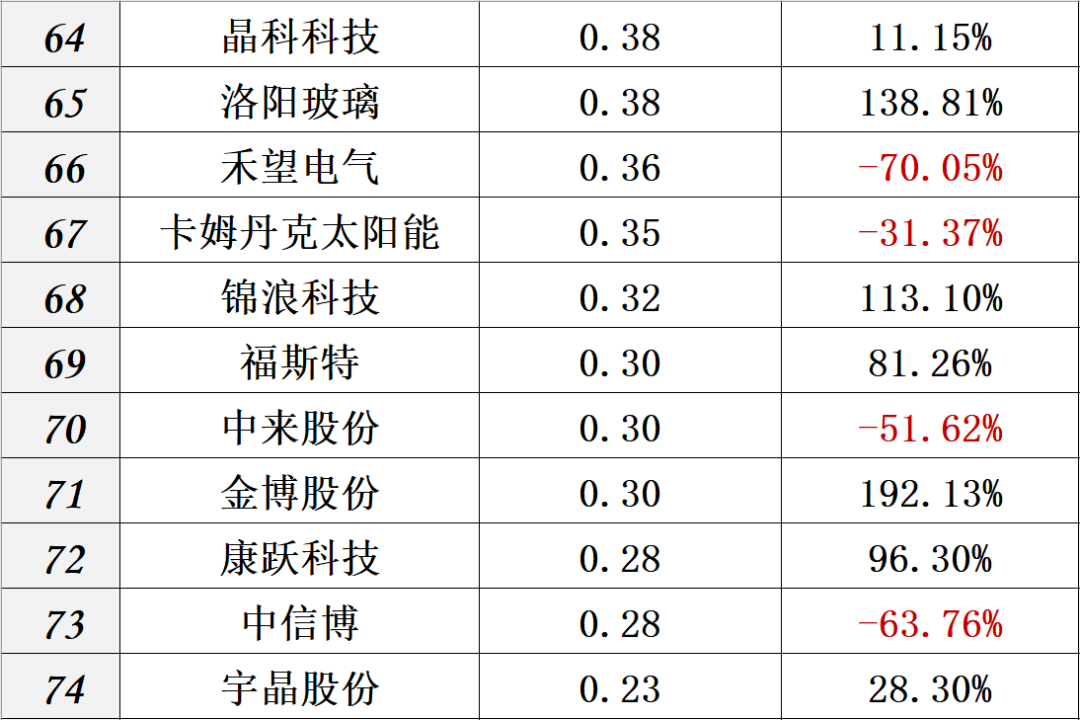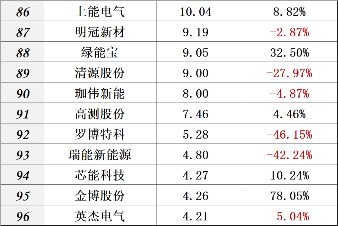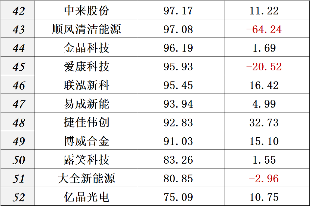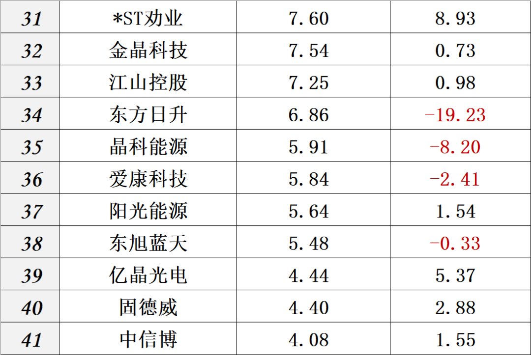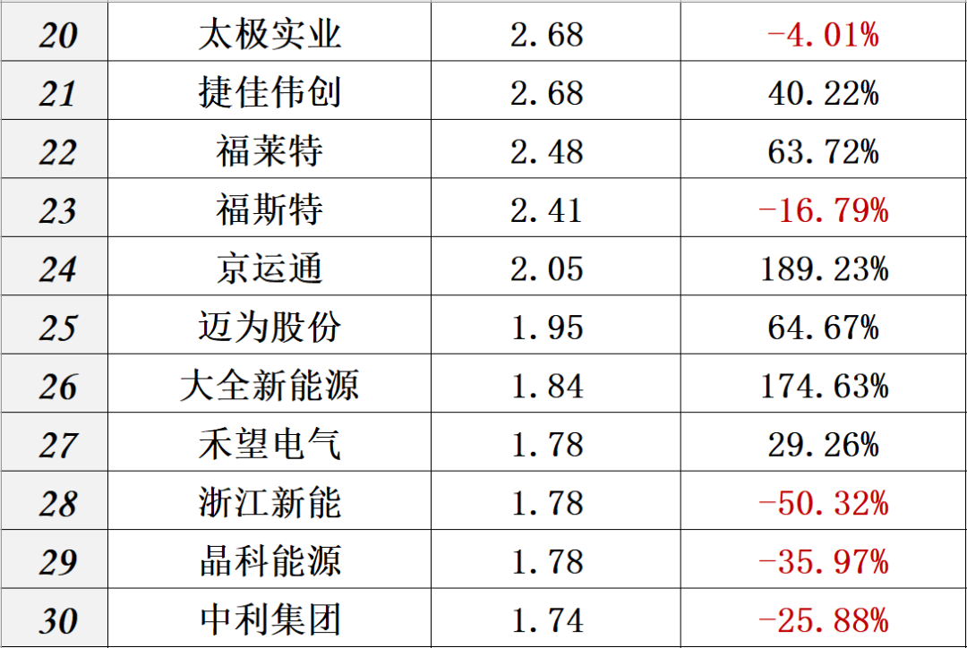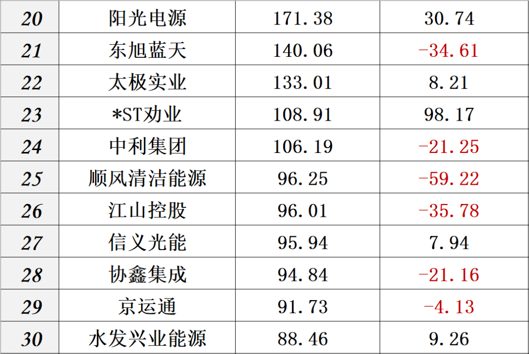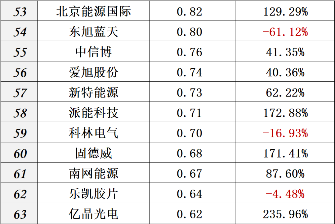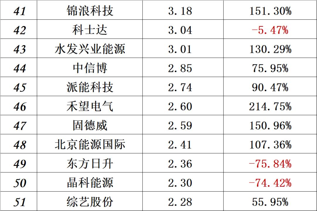 其中,52家光伏企业净筹资规模在1亿元以上,24家企业净筹资在10亿元以上,前三名为吉电股份、净筹资84.55亿元,晶科能源、净筹资62.97亿元,通威股份、57.95亿元。