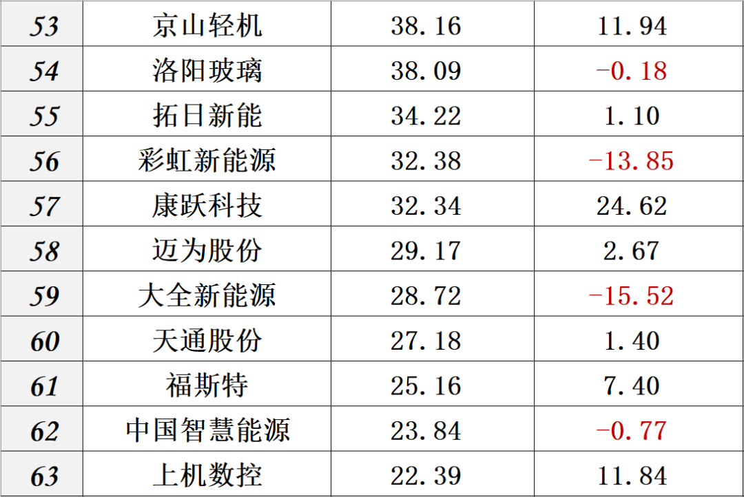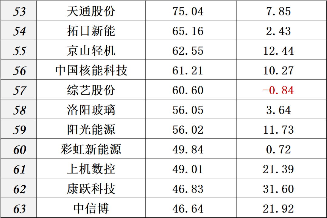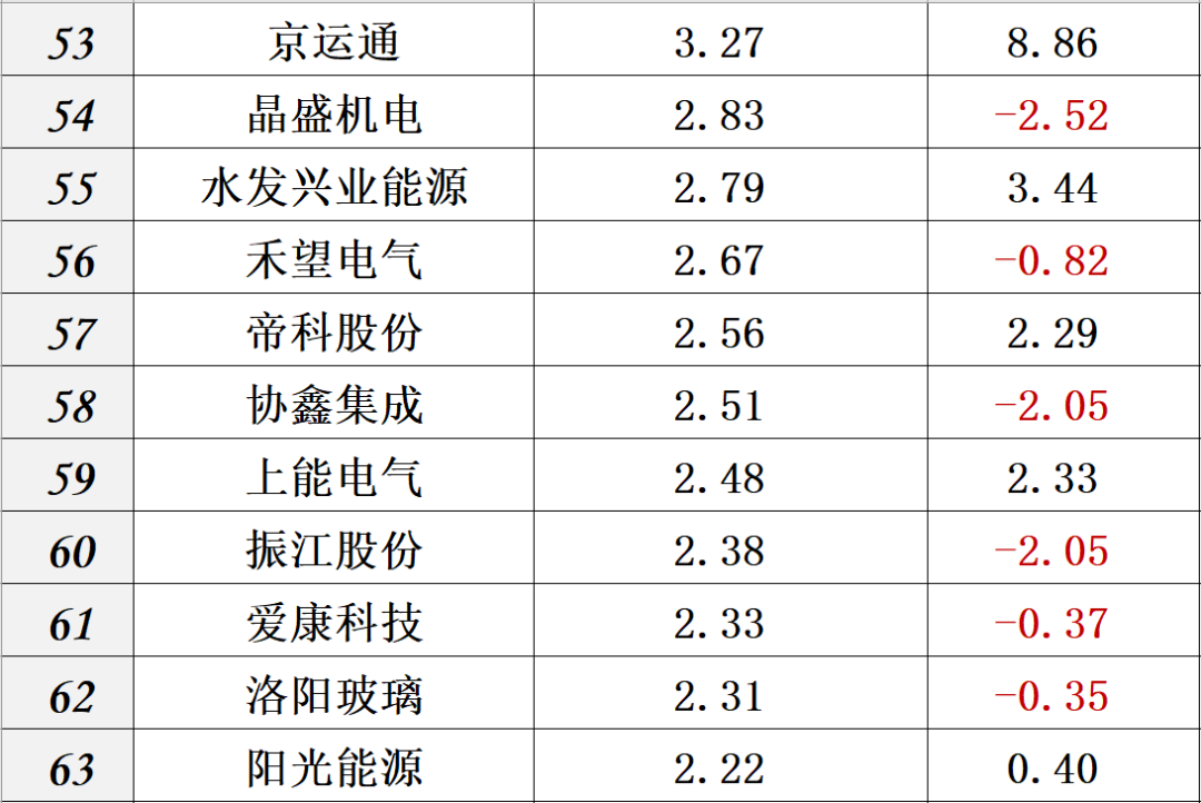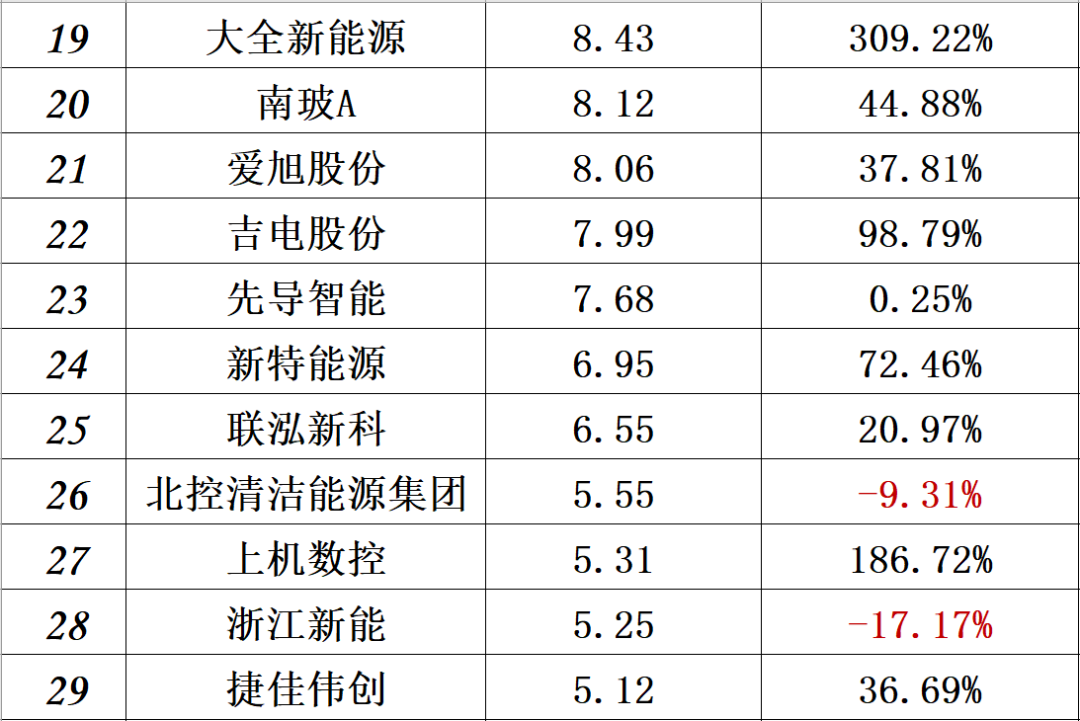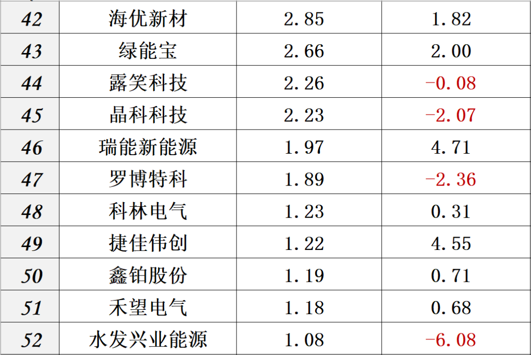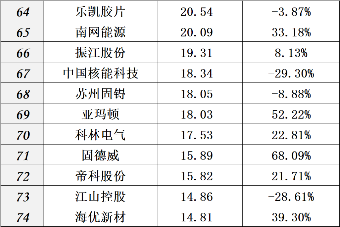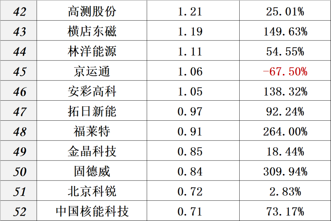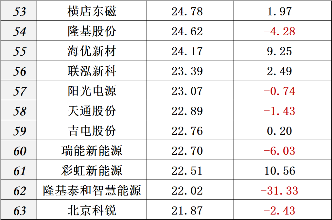 其中,52家光伏企业净筹资规模在1亿元以上,24家企业净筹资在10亿元以上,前三名为吉电股份、净筹资84.55亿元,晶科能源、净筹资62.97亿元,通威股份、57.95亿元。