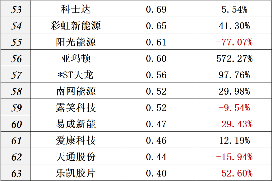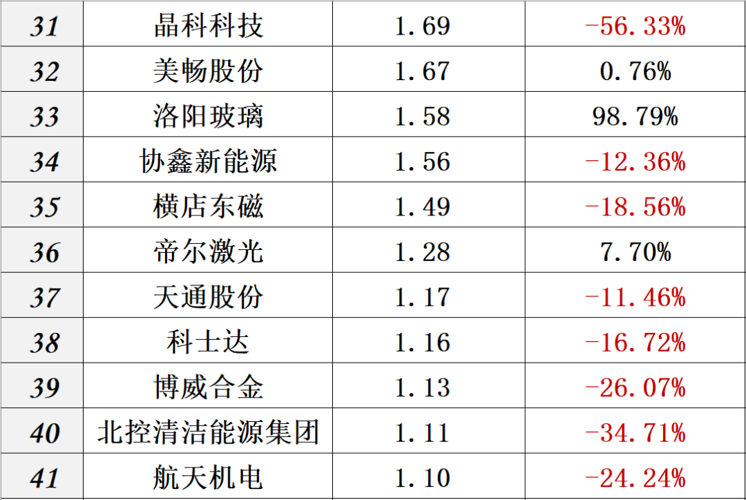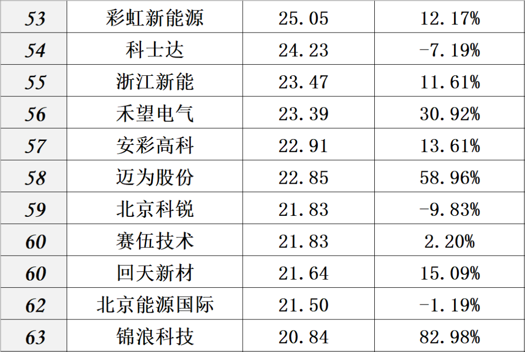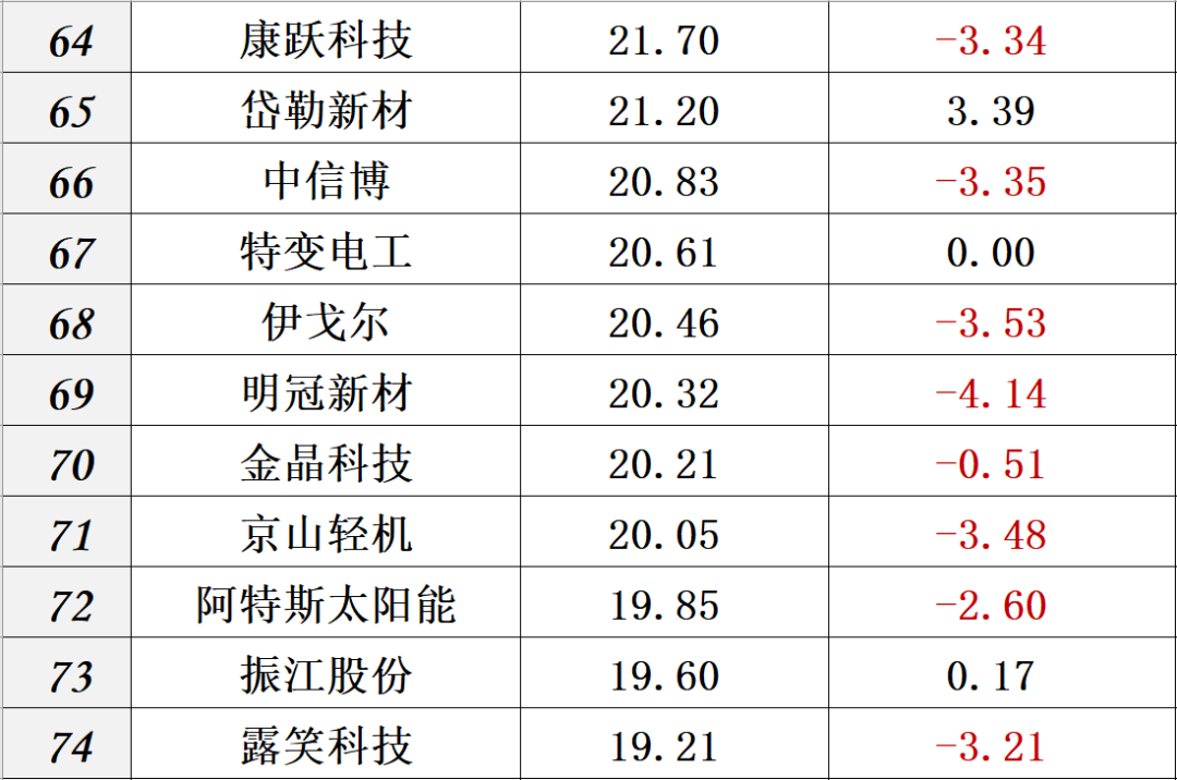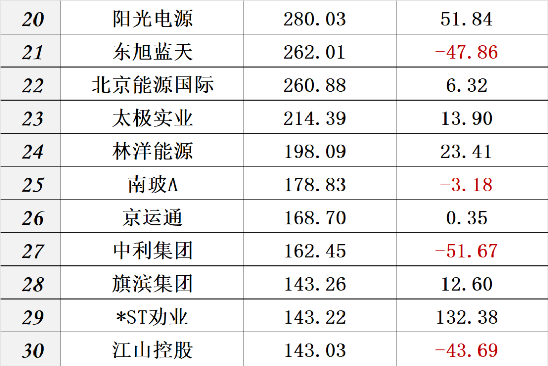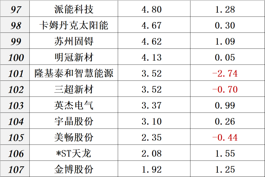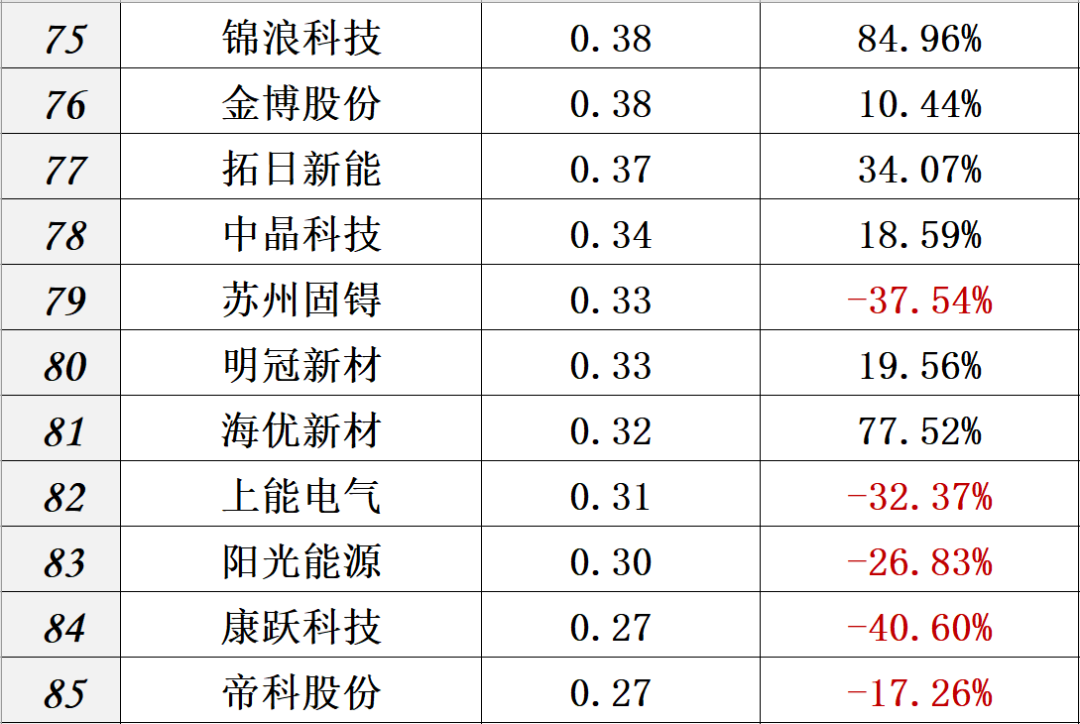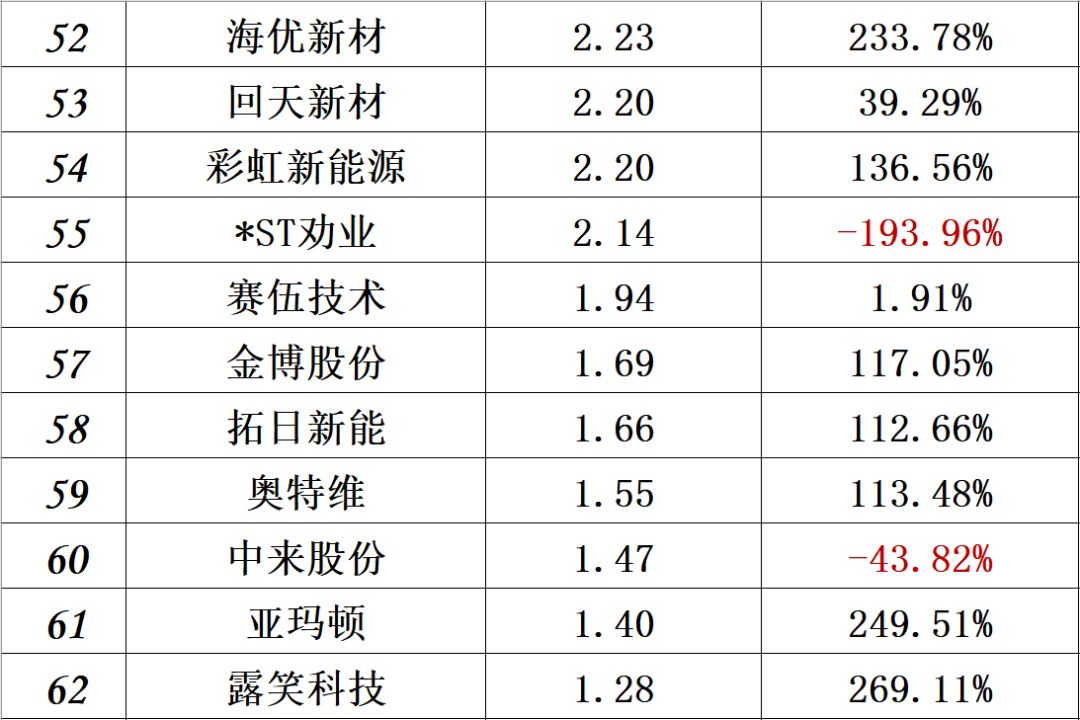 其中,52家光伏企业净筹资规模在1亿元以上,24家企业净筹资在10亿元以上,前三名为吉电股份、净筹资84.55亿元,晶科能源、净筹资62.97亿元,通威股份、57.95亿元。