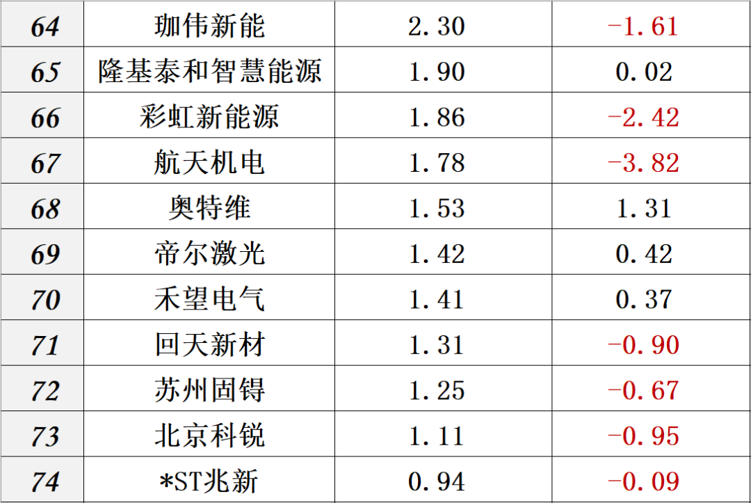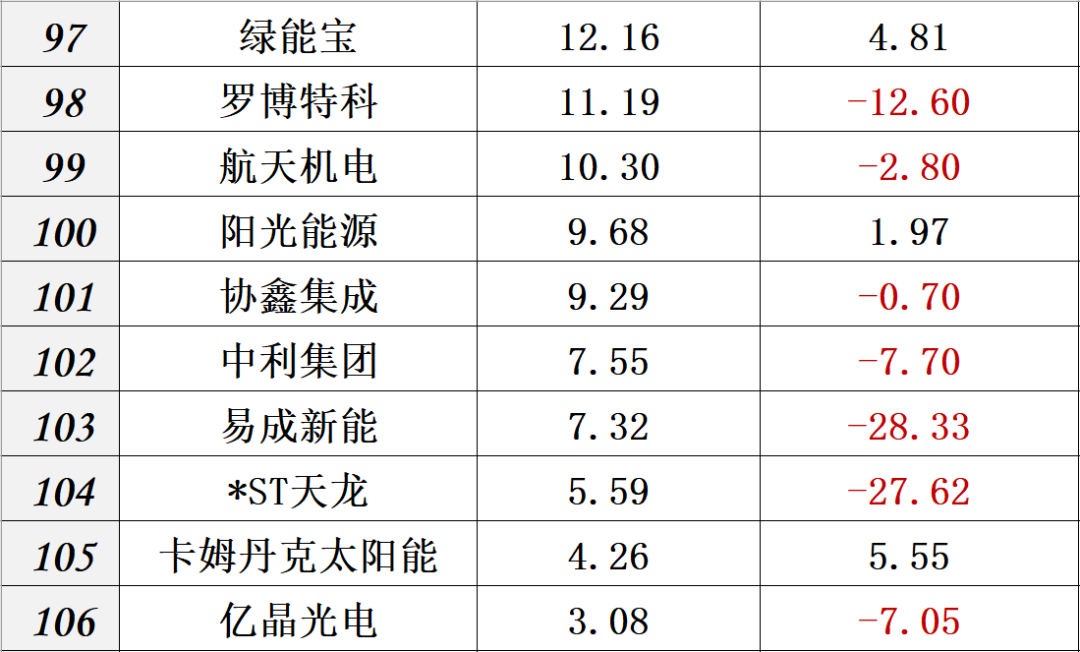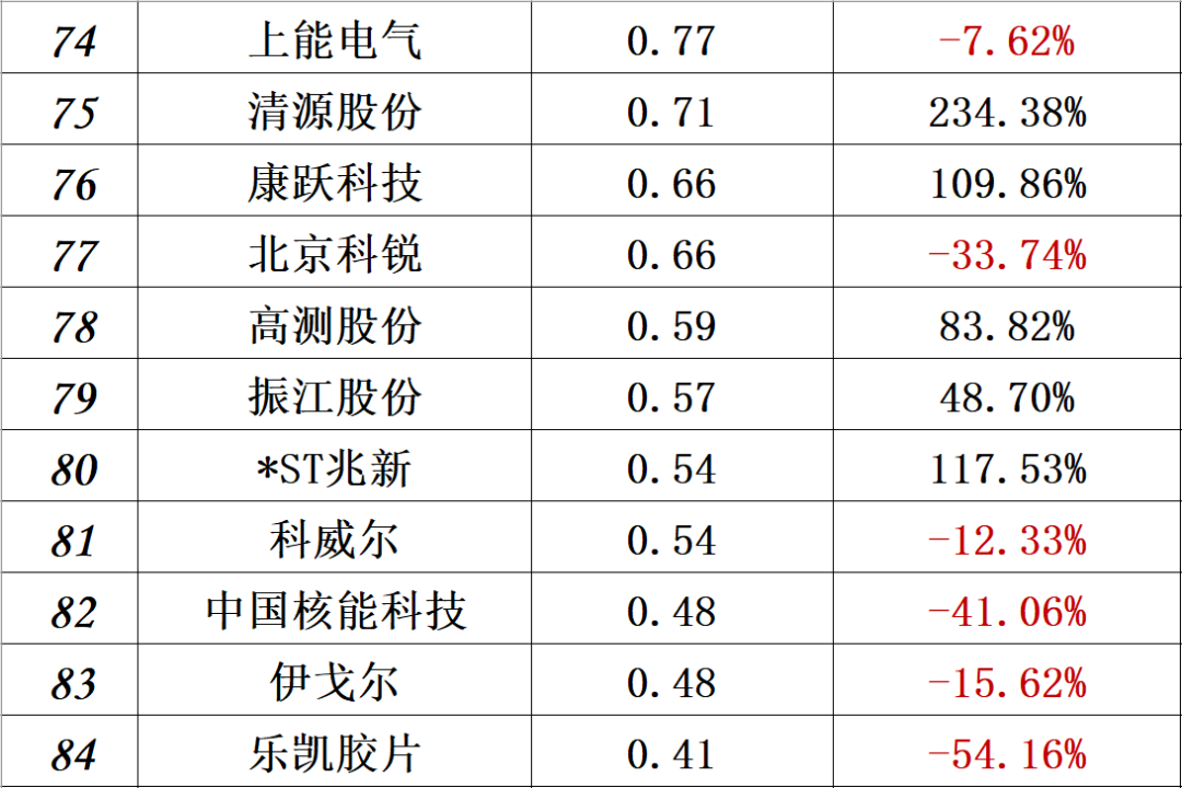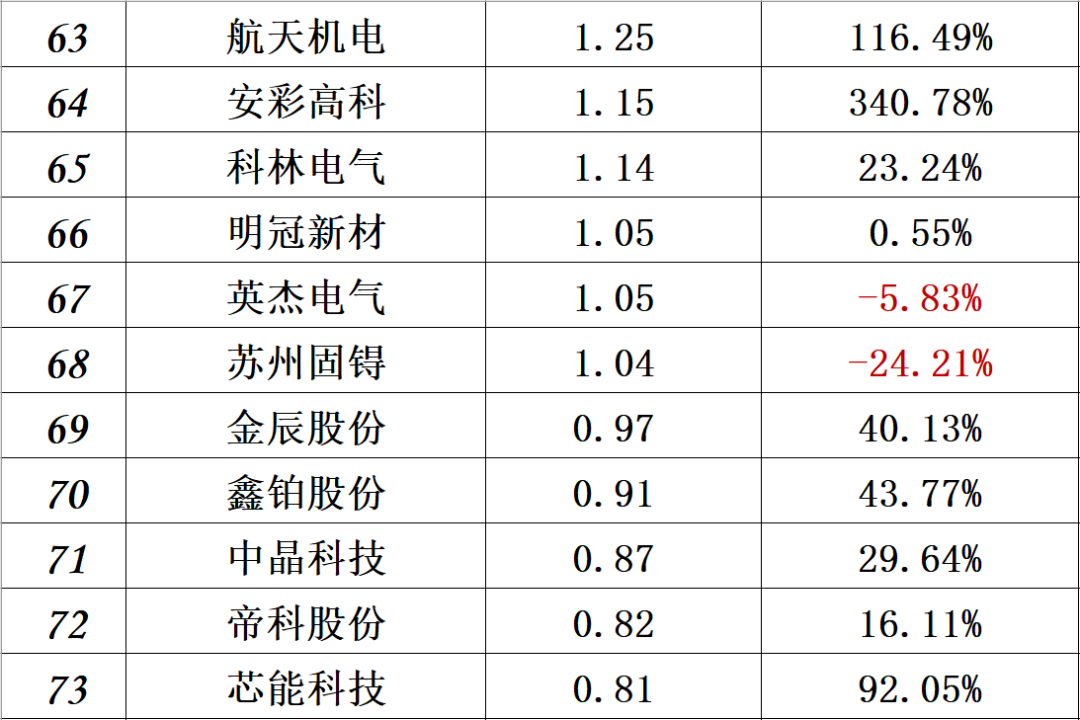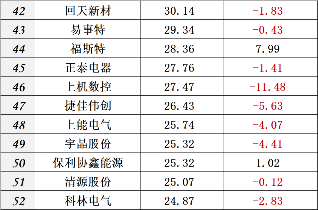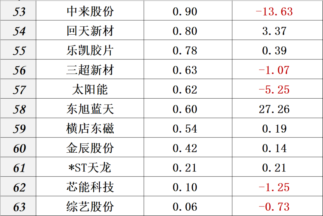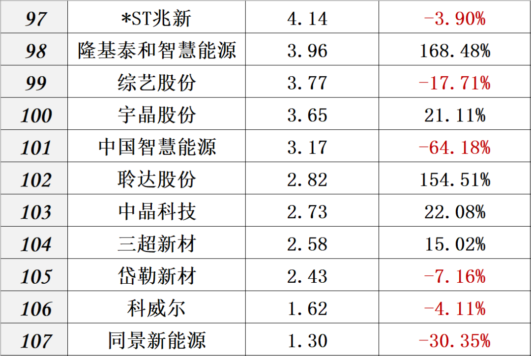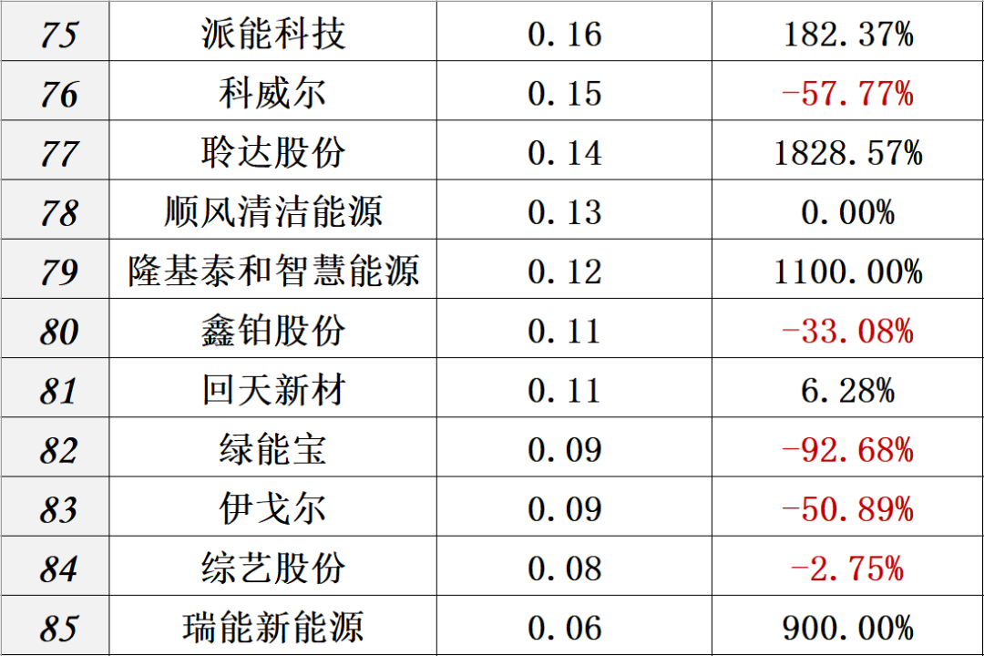 其中,52家光伏企业净筹资规模在1亿元以上,24家企业净筹资在10亿元以上,前三名为吉电股份、净筹资84.55亿元,晶科能源、净筹资62.97亿元,通威股份、57.95亿元。