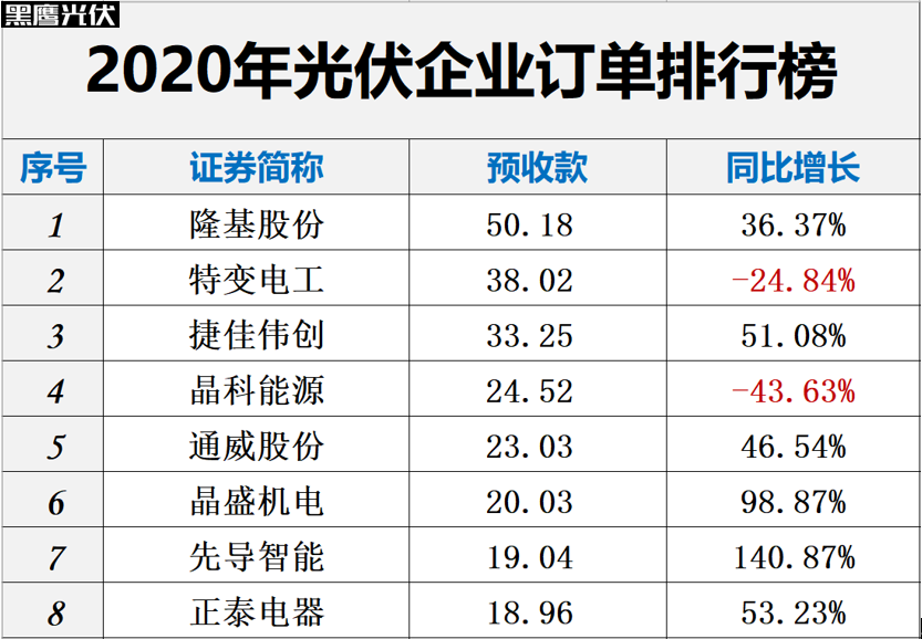 其中,46家光伏企业预收款规模在1亿元以上,15家企业预收款在10亿元以上,前三名企业隆基股份、预收款50.18亿元,特变电工、预收款38.02亿元,捷佳伟创、预收款33.25亿元。