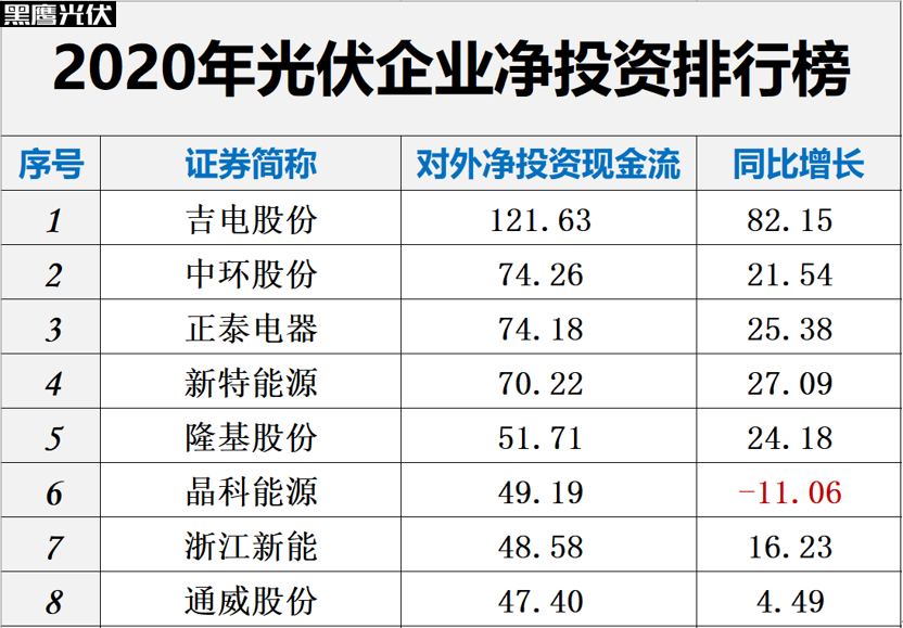 另据统计,2020年61家光伏企业对外净投资规模为正增长,10家企业对外净投资增长在10亿元以上,前三名为吉电股份、净投资同比增长82.15亿元,津劝业、增长31.37亿元,新特能源、增长27.09%。