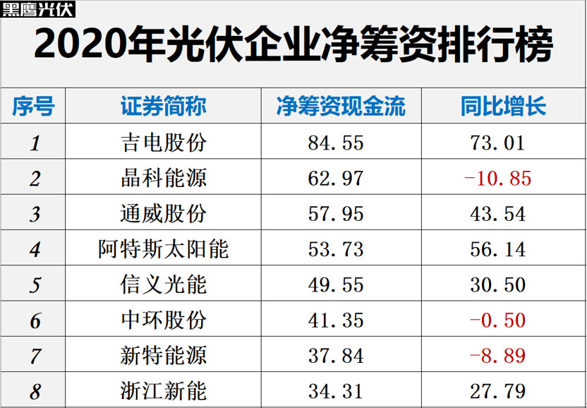 另据统计,2020年64家光伏企业净筹资规模为正增长,18家企业增长在10亿元以上,前三名为吉电股份、增长73.01亿元,阿特斯、增长56.14亿元,通威股份、增长43.54亿元。